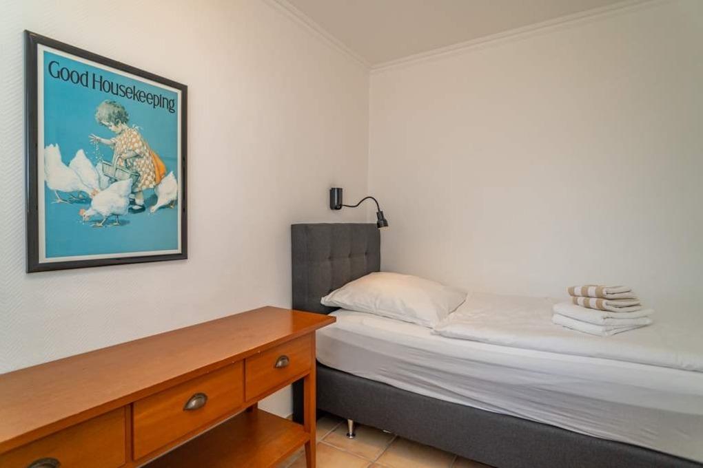 Das Schlafzimmer ist mit zwei hochwertigen, auseinander stehenden Einzel-Polsterbetten (Liegefläche jeweils[nbsp] 200 x 0,90 cm).