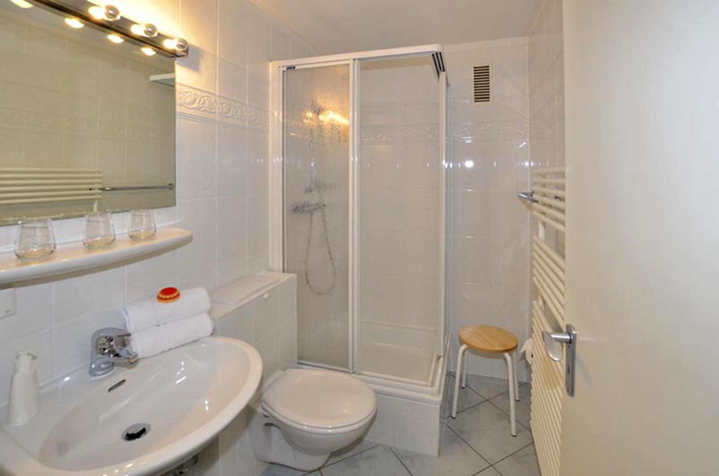 Im Bad befinden sich eine Dusche, ein WC, ein Waschtisch, ein Handtuchtrockner und ein Fön.