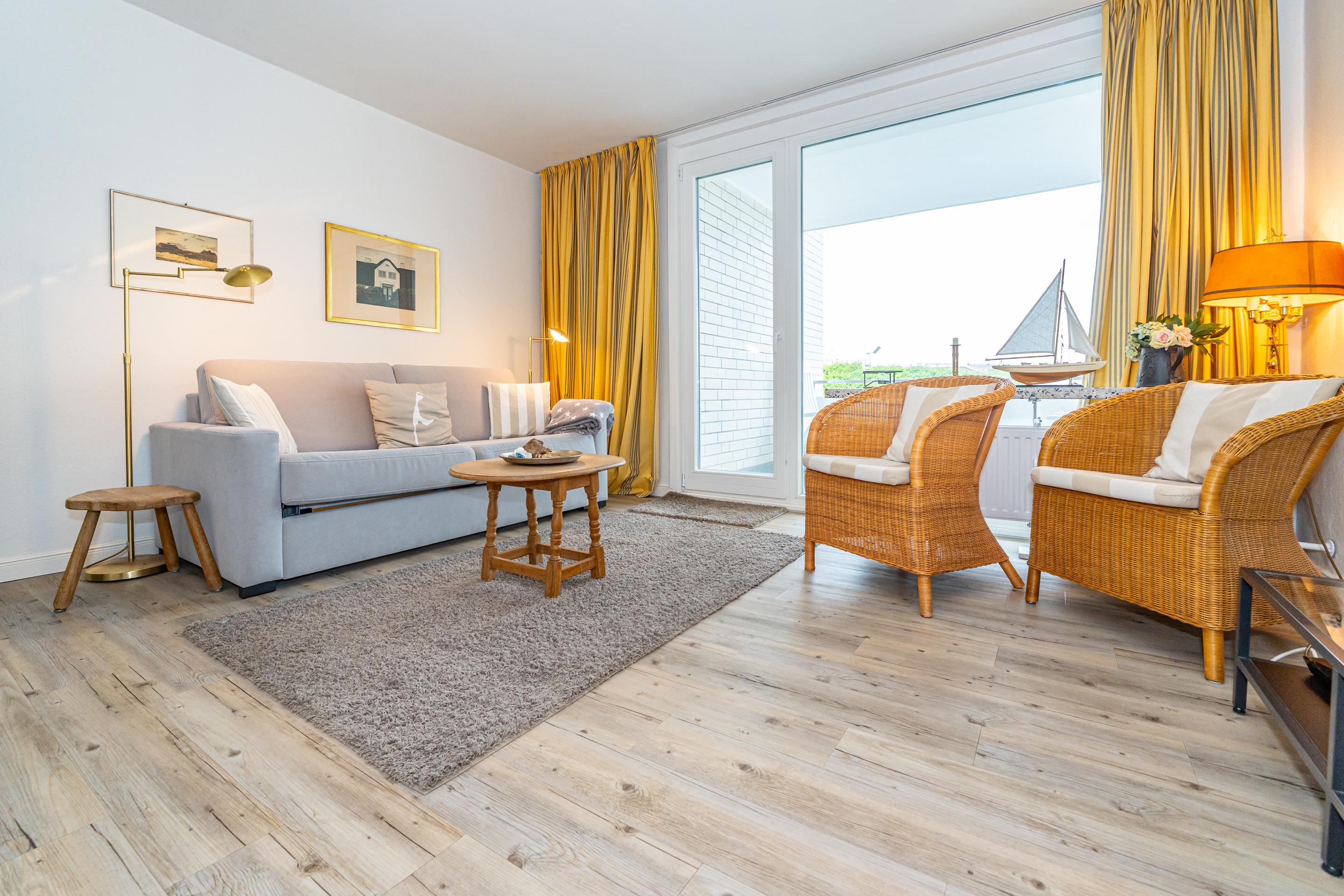 Der Wohnraum hat eine cremefarbene Doppelschlafcouch mit[nbsp][nbsp]integrierter, guter, durchgehender Matratze in optimaler Liegehöhe (Liegefläche ca. 1,80 x 1,98 m), zwei Korbsessel, einen Essplatz, einen Sat-Flachbild-TV, WLAN und eine offene Küchenzeile.