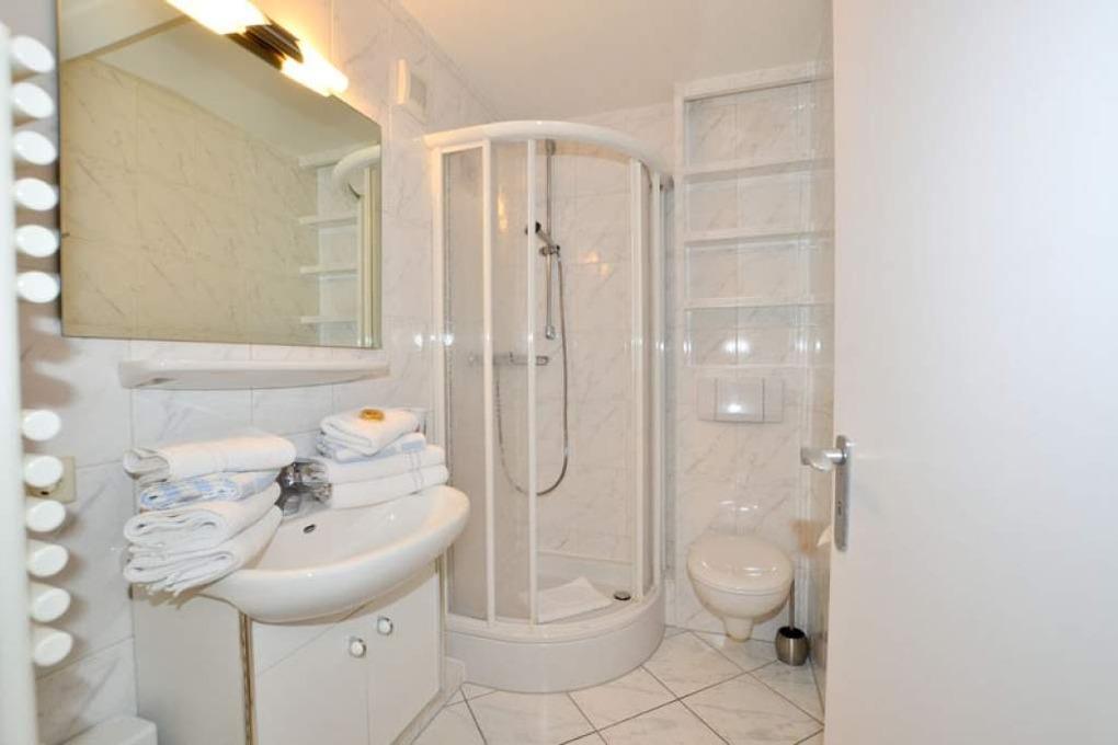 Im Bad befinden sich eine Dusche, ein WC, ein Waschtisch und ein Handtuchtrockner.