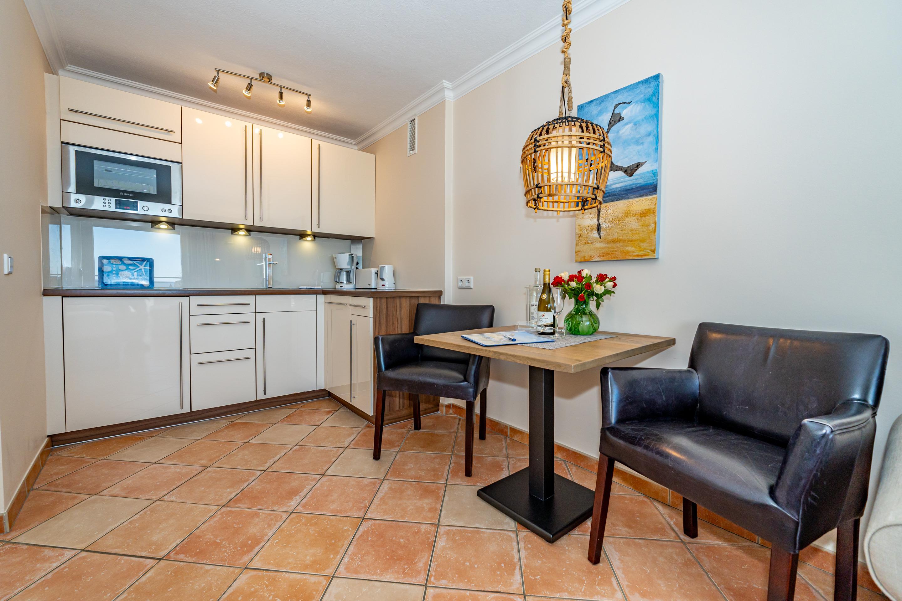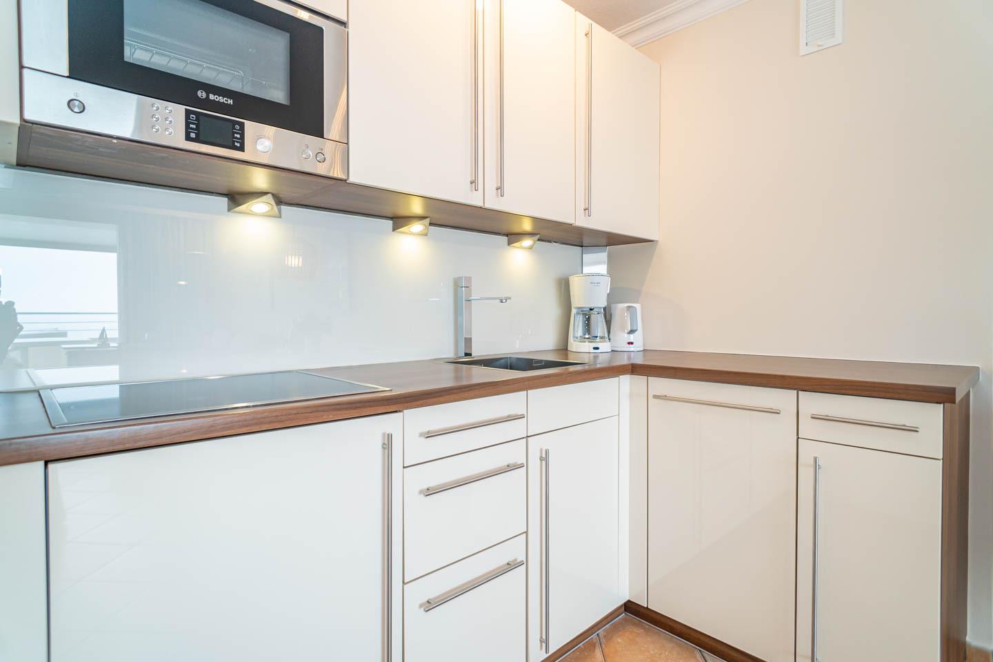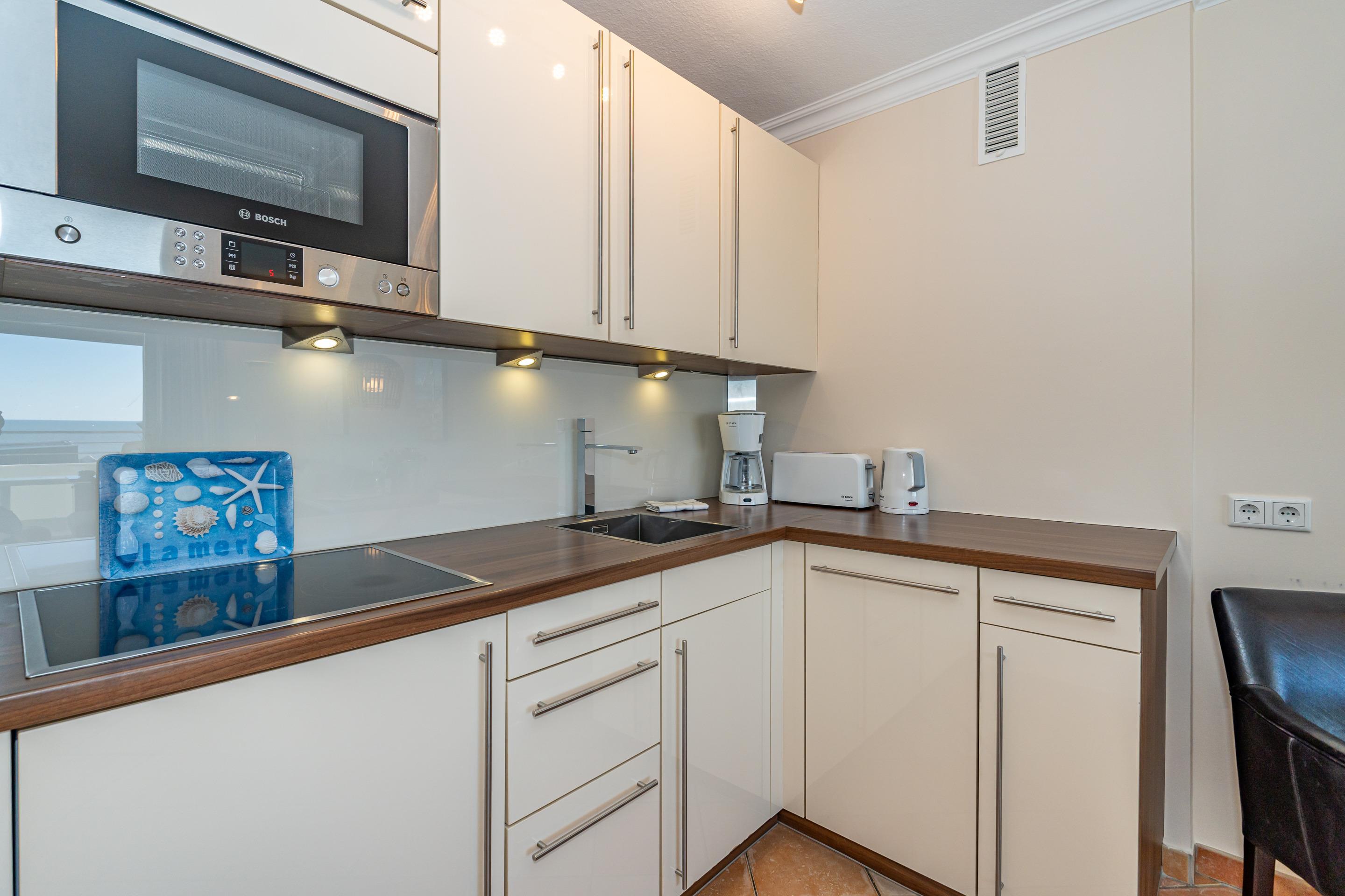 Die offene Einbauküche ist voll ausgestattet mit einem Geschirrspüler, einer Mikrowelle, einer Nespresso-Maschine, einem 4-Platten-Ceranfeld sowie einem Kühlschrank mit 3*-Gefrierfach. Kaffeemaschine, Wasserkocher und Toaster gehören ebenfalls zur Grundausstattung.