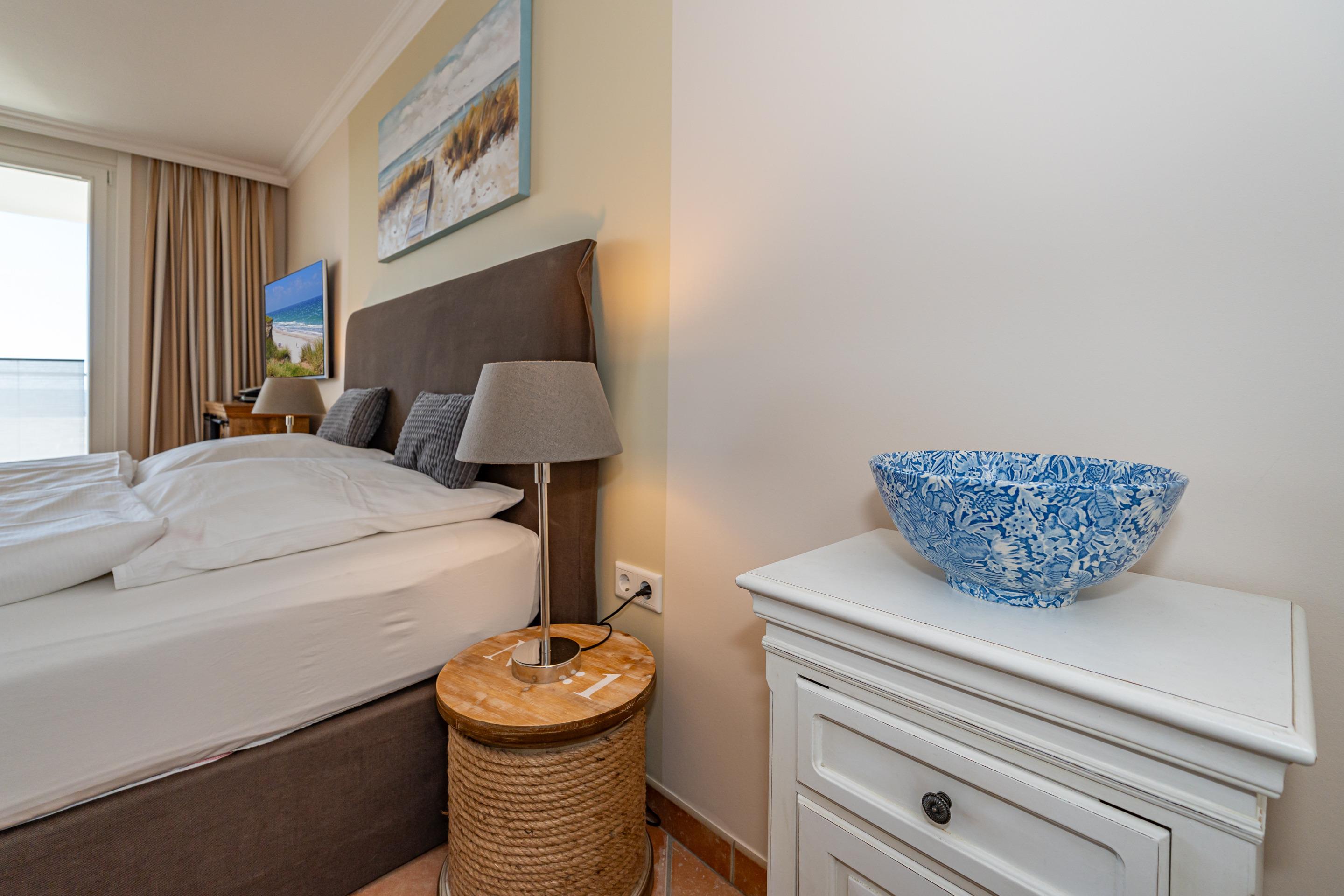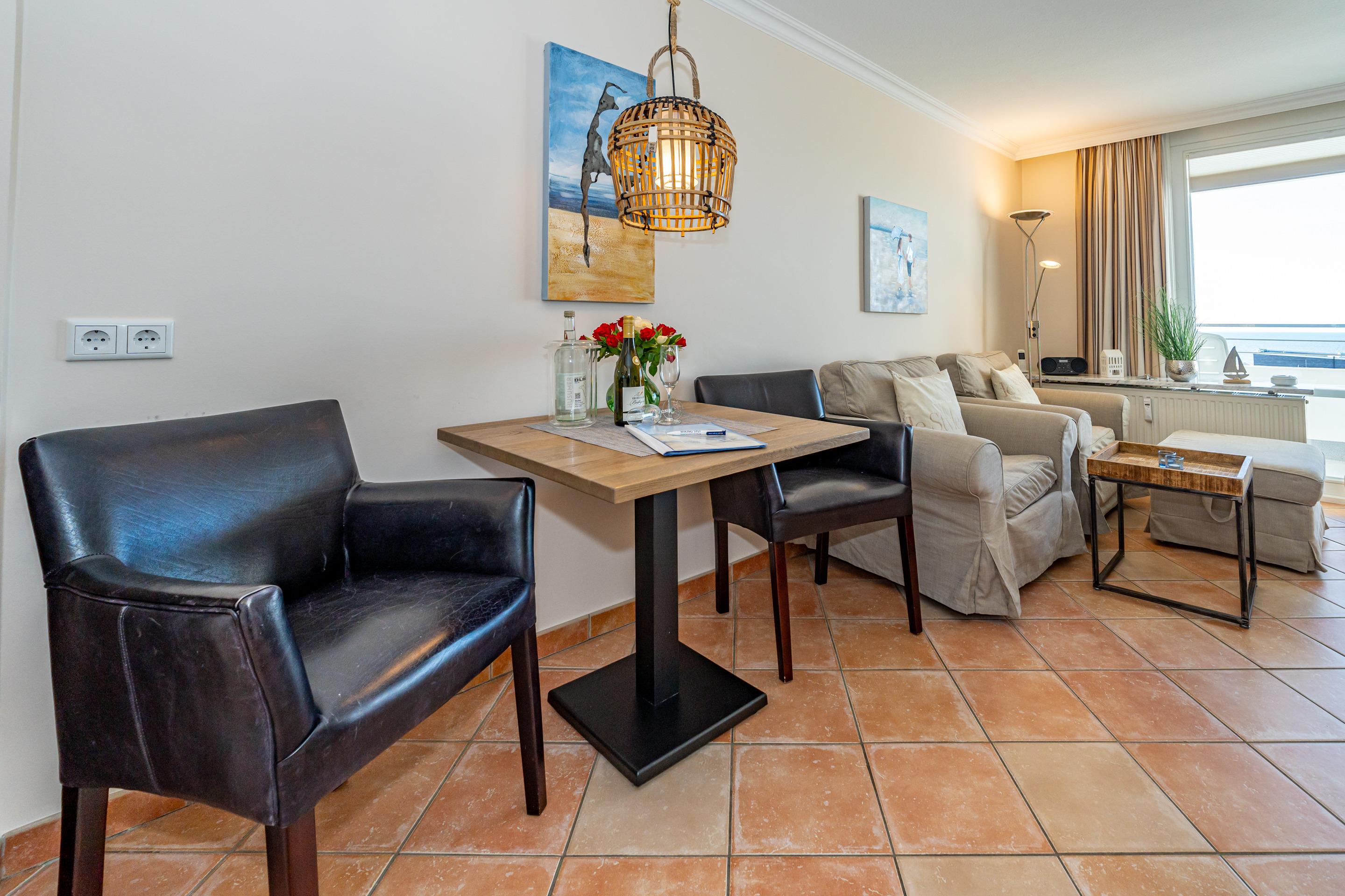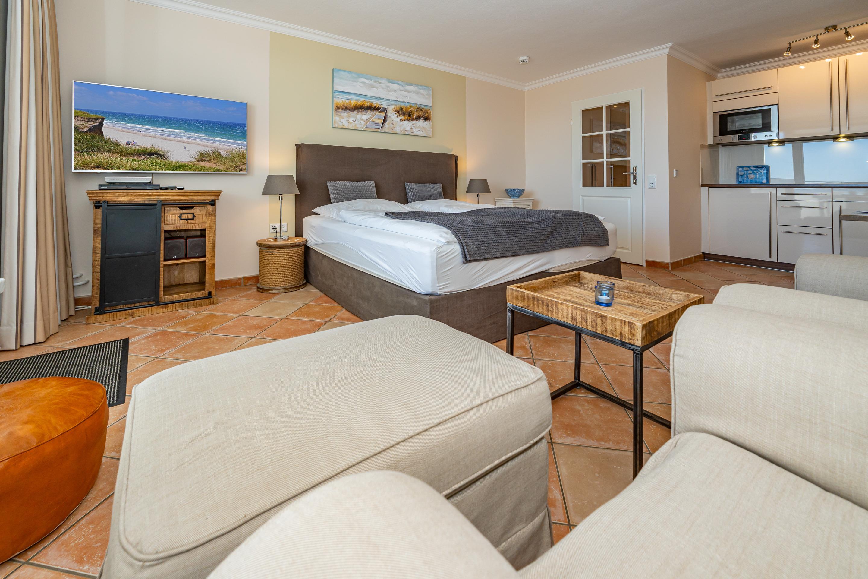 Der Wohn-/Schlafraum besteht aus einem feststehendem Boxspring-Doppelbett (Liegefläche 1,80 x 2,00m, mit besonders komfortablen Einzelmatratzen), 2 gemütlichen Sessel, einem Essplatz mit zwei bequemen Armlehnstühlen, einem Sat-Flachbild-TV mit digitalem Empfang, Radio-CD sowie einem Festnetztelefon inklusive Flatrate für Gespräche ins deutsche Festnetz, kostenloser Internetnutzung (ohne Gewähr).