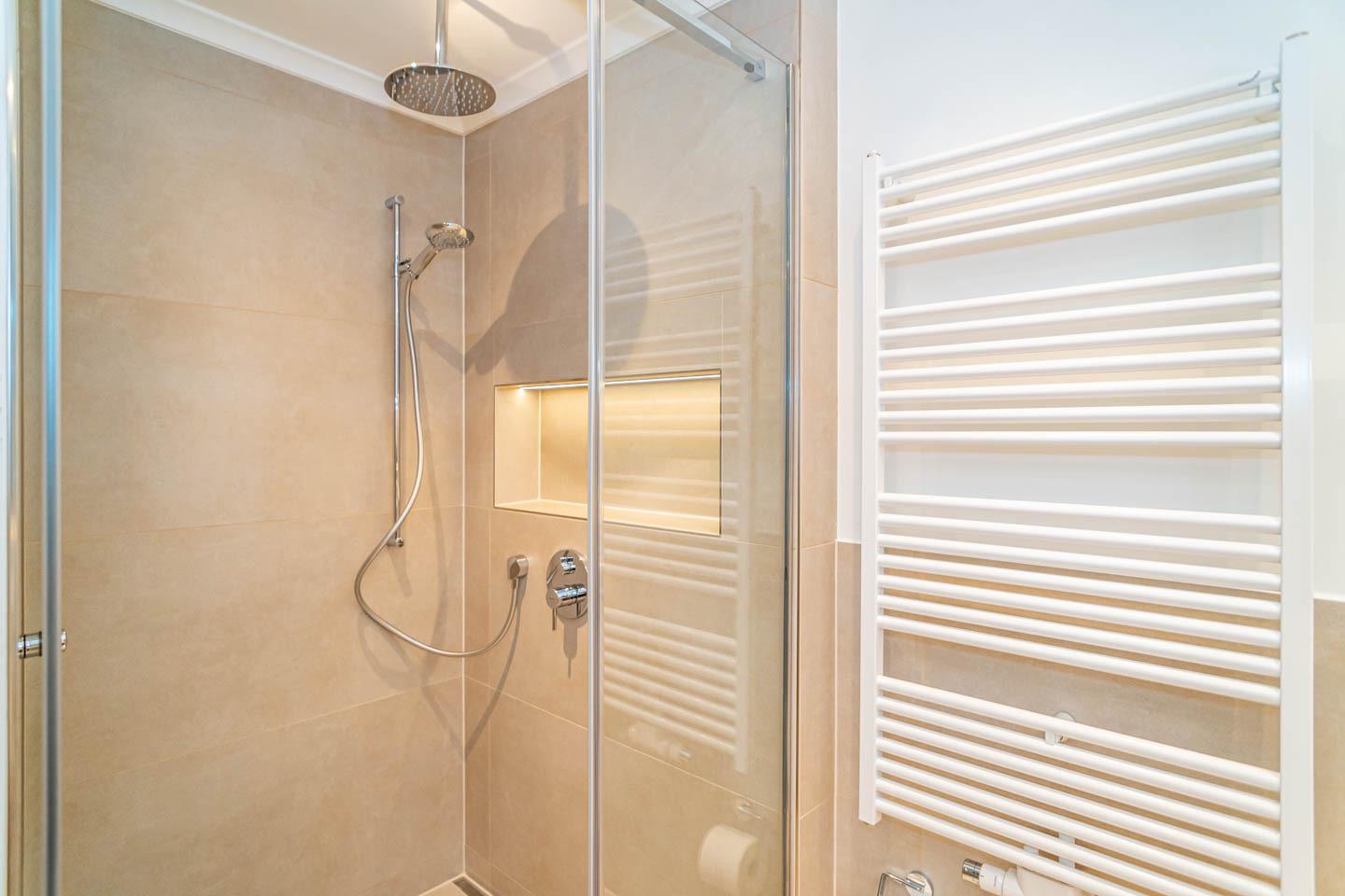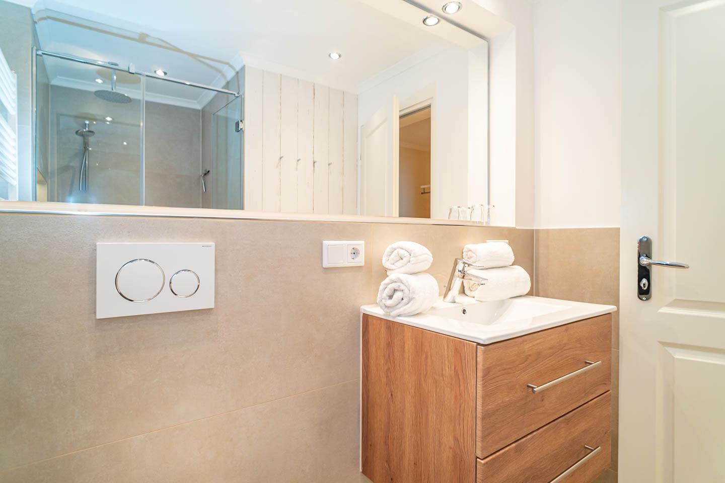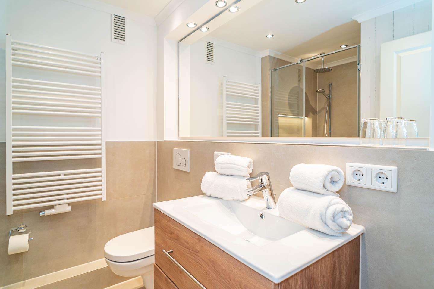 Im modernen Badezimmer erwartet Sie eine großzügige Dusche mit extraflachem Einstieg, ein Waschtisch, Handtuchtrockner, Fön und ein WC.