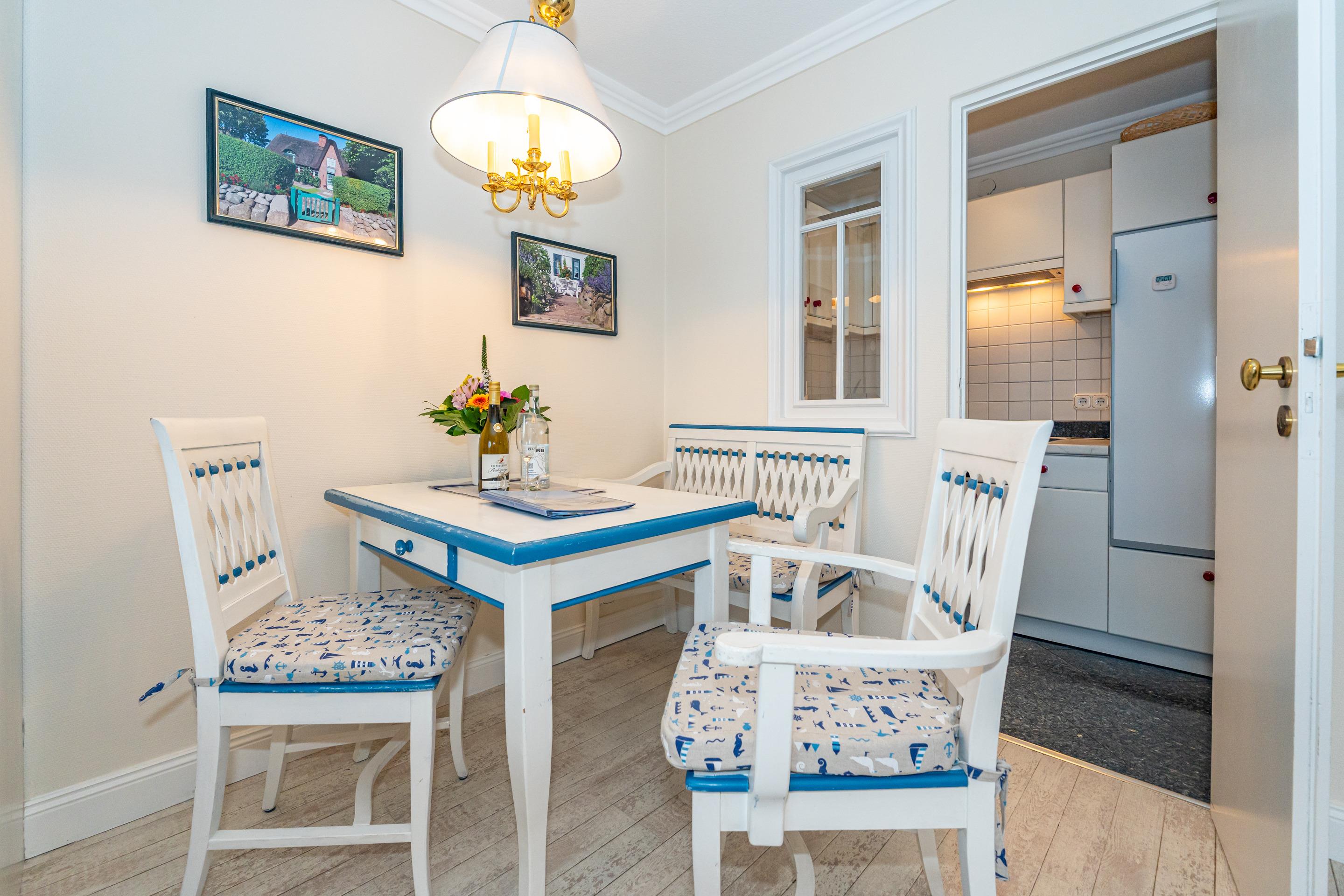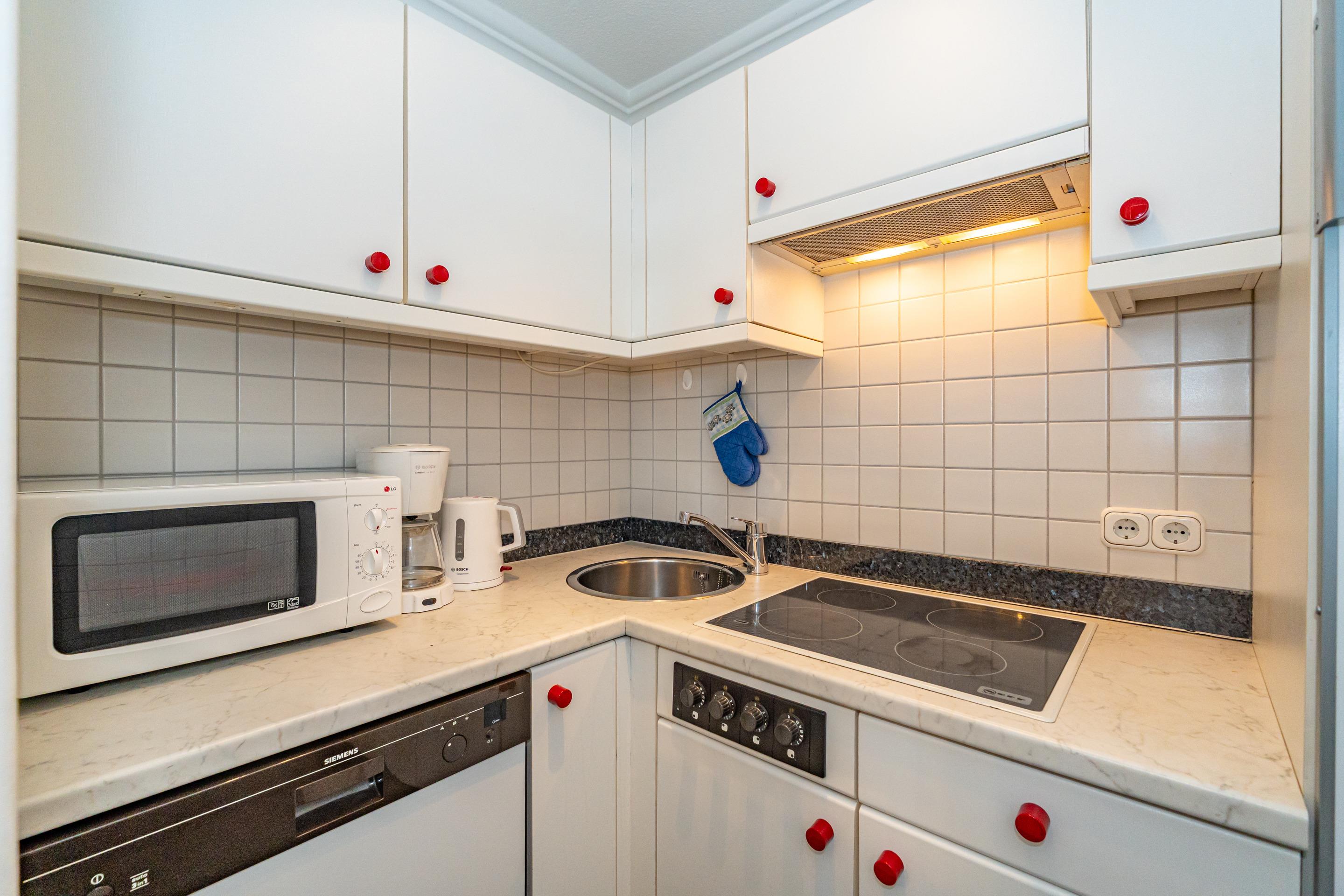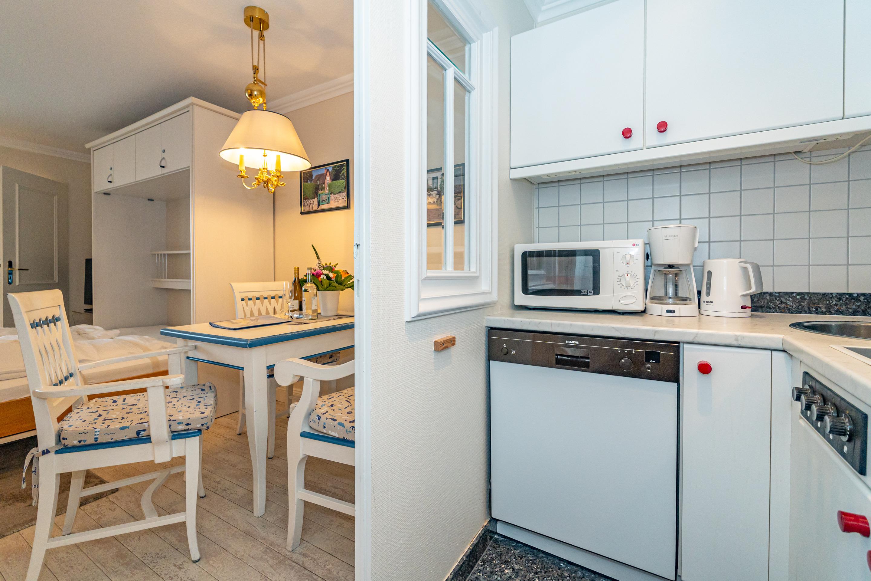 Die kleine separate Küche hat einen Geschirrspüler, ein Ceranfeld mit 4-Kochfeldern und ein Kühlschrank mit 3*-Gefrierfach. Kaffeemaschine, Wasserkocher und Toaster gehören zur Grundausstattung.