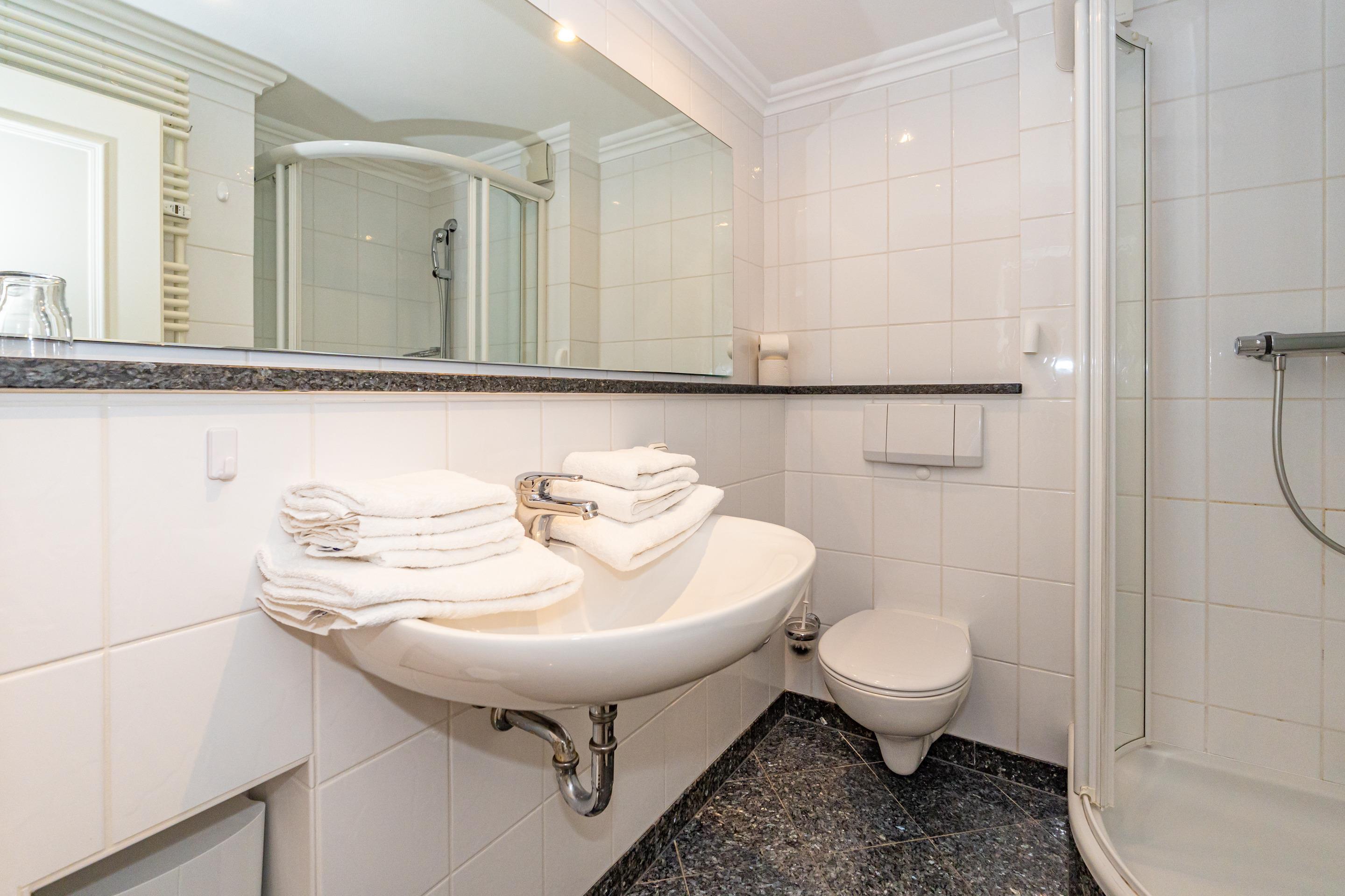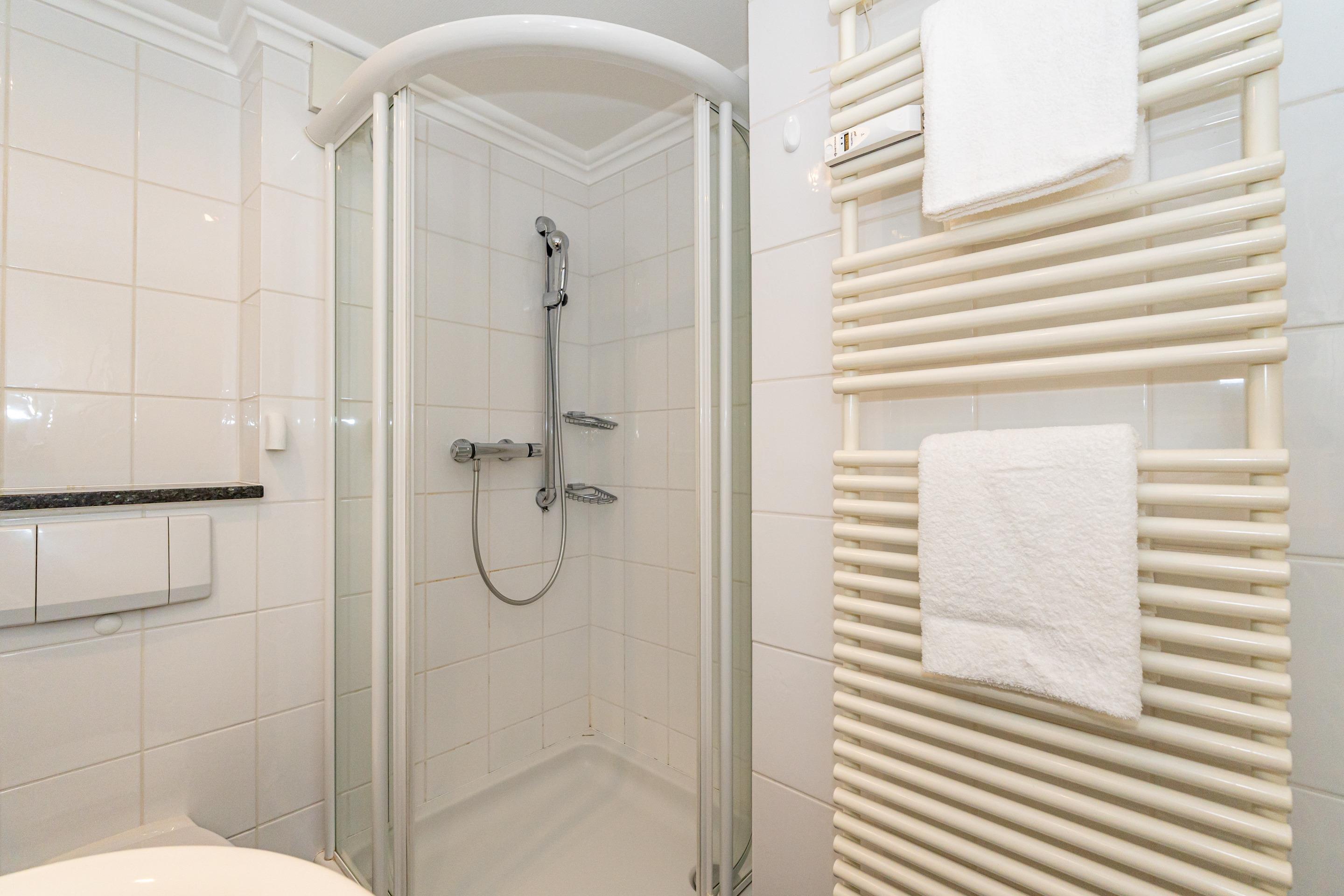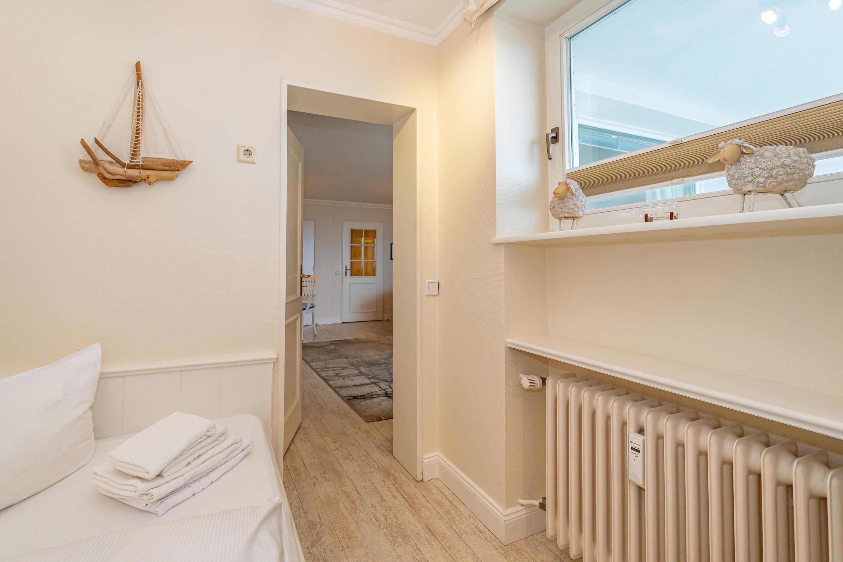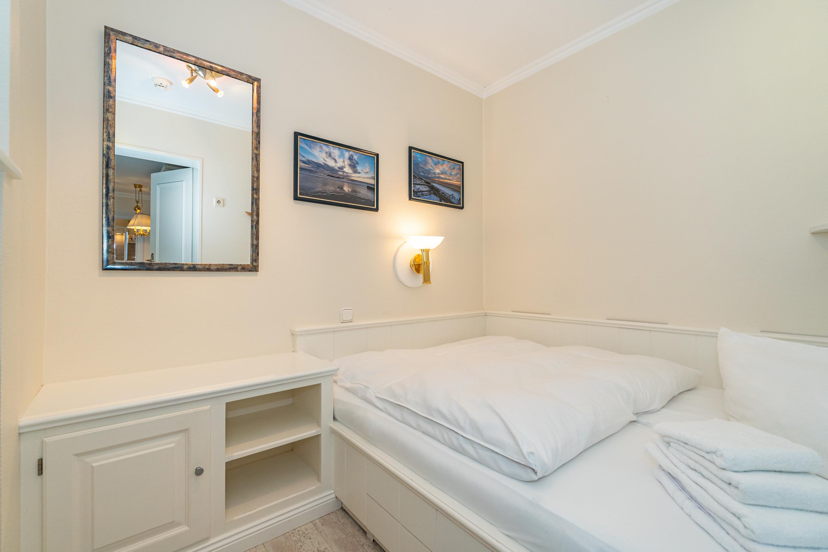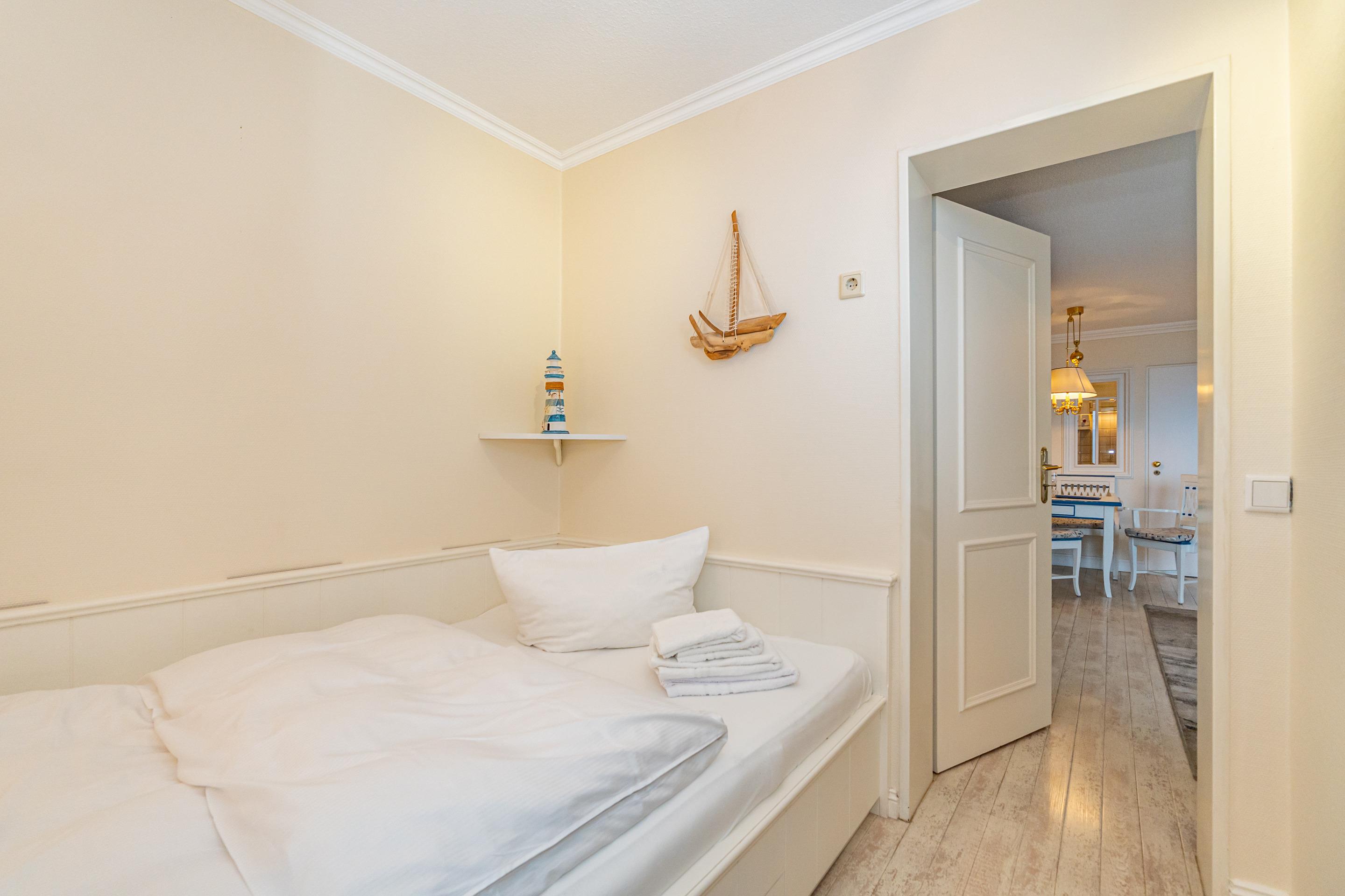 Vom Wohnzimmer gelangt man in das kleine Schlafzimmer mit Einzelbett (Maße: 1,40m x 2,00 m). Im Bad befinden sich eine Dusche, ein WC und ein Waschtisch.