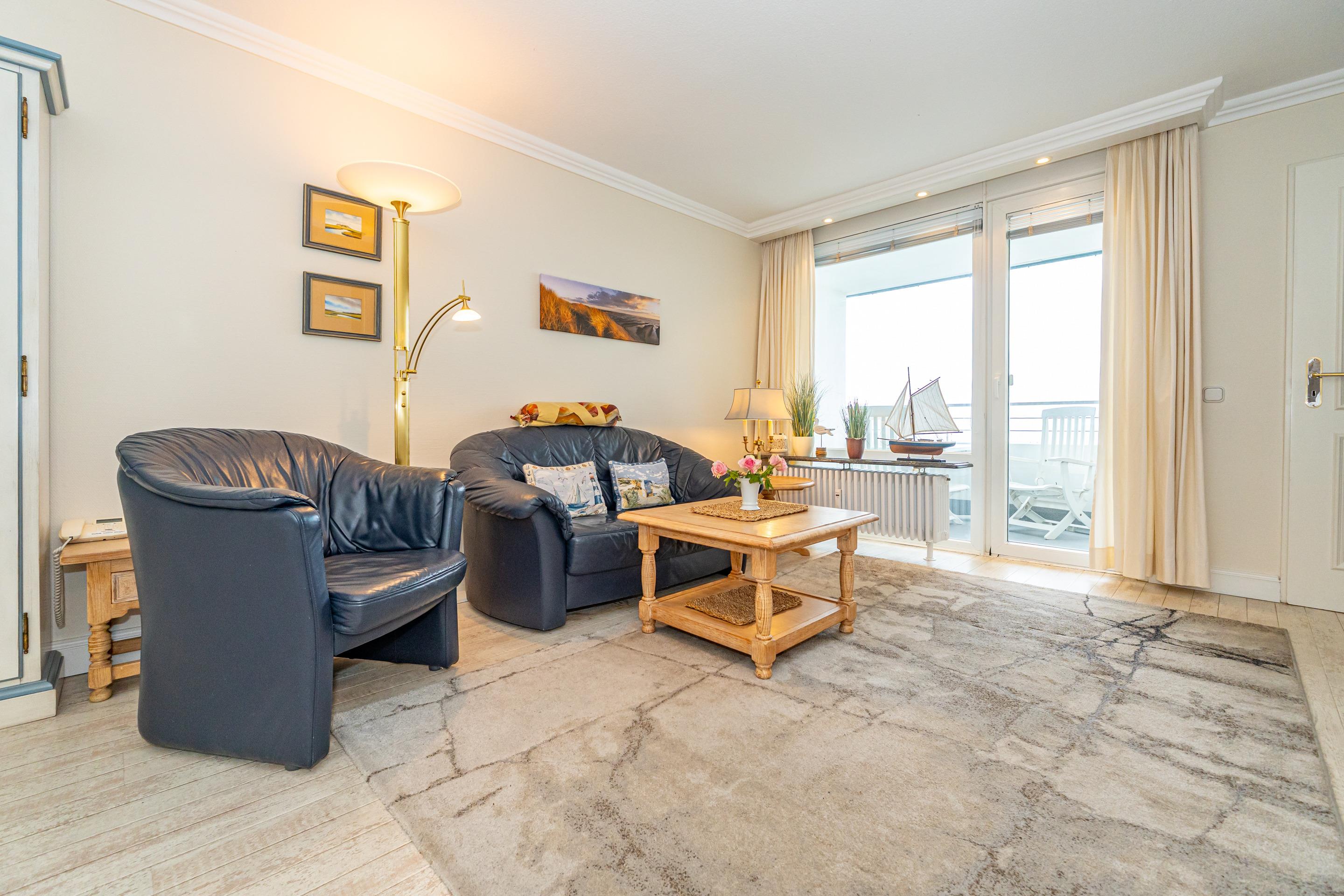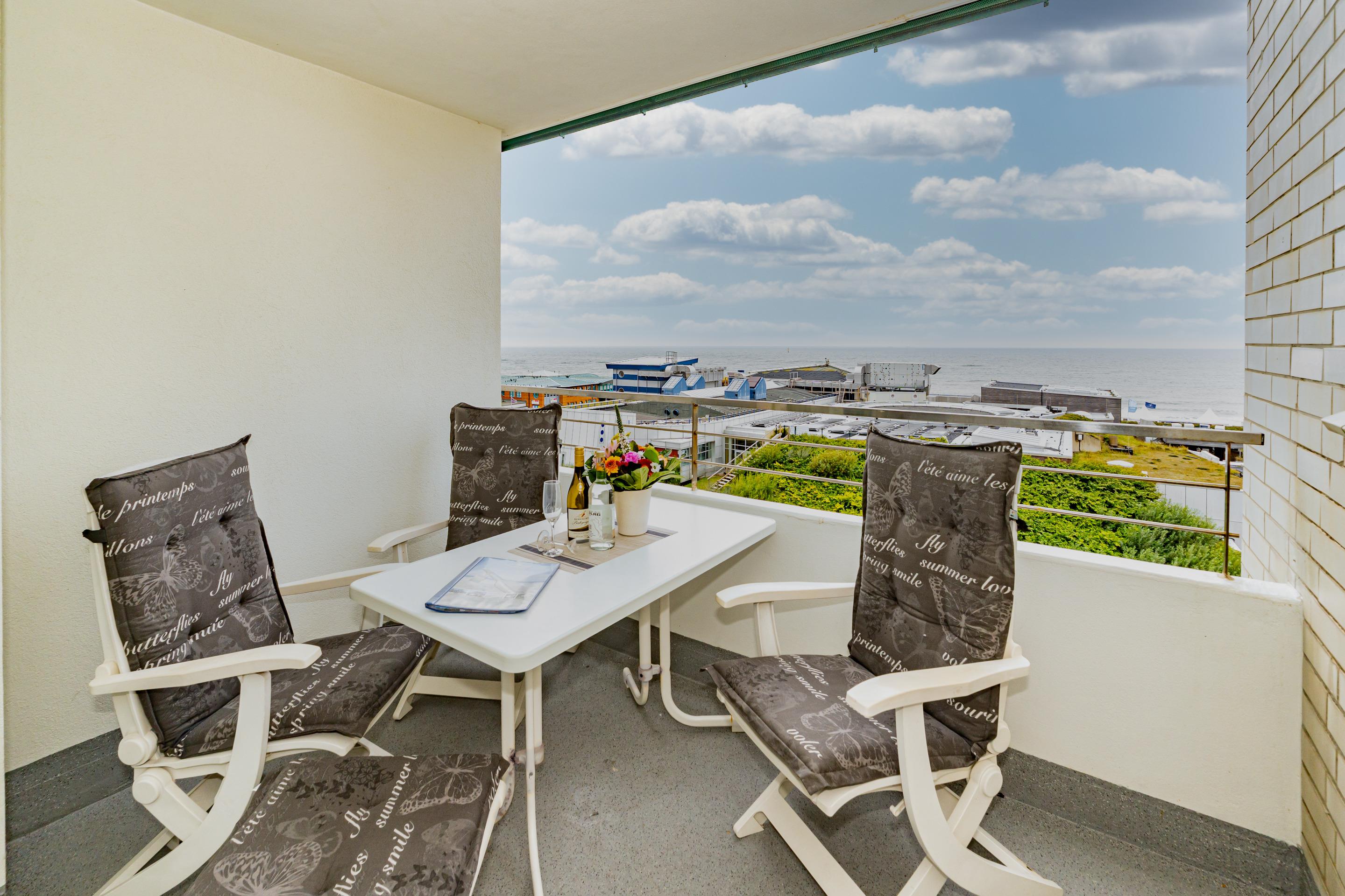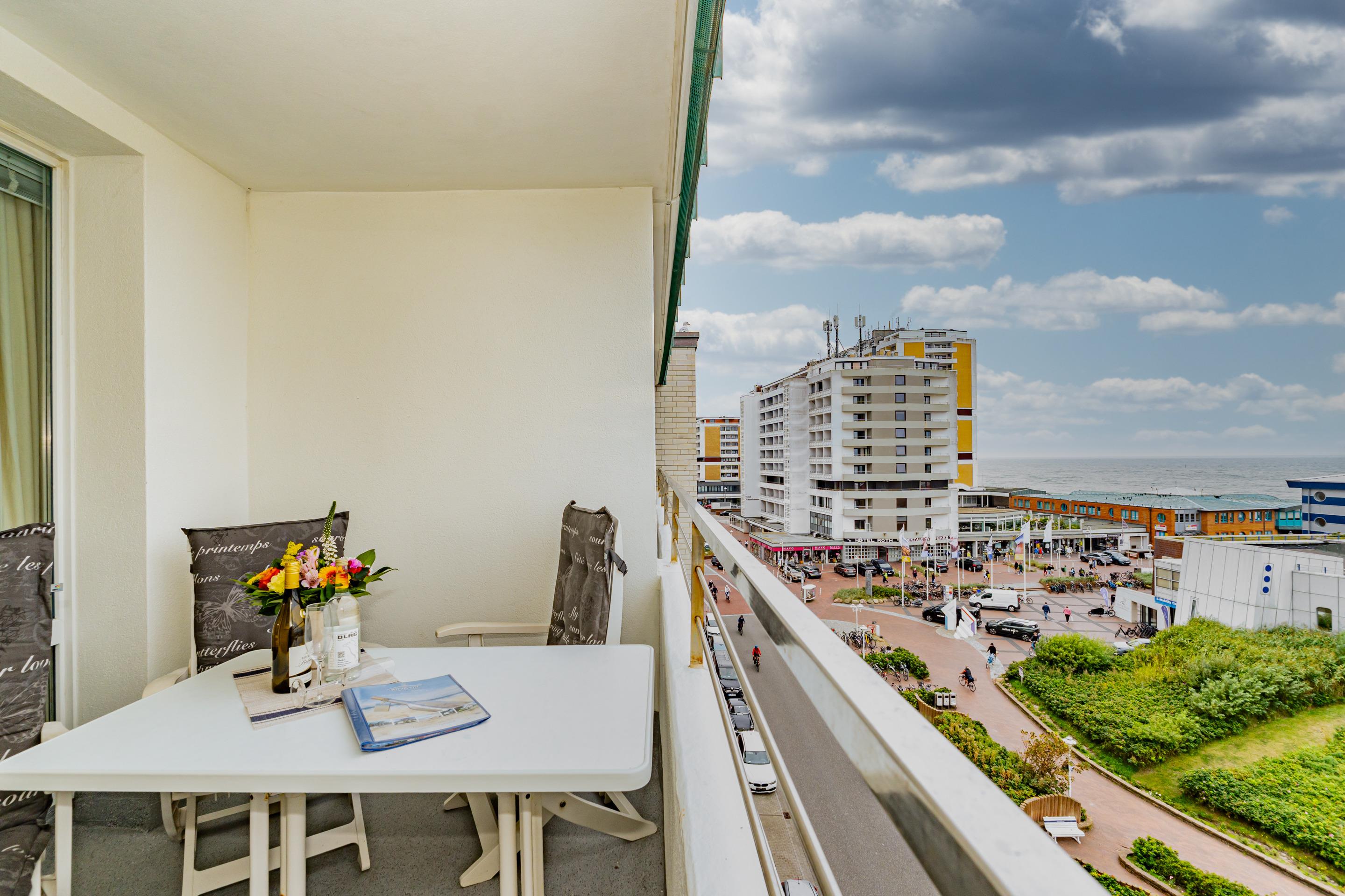 Exklusive 1,5-Zimmer-Nichtraucher-Ferienwohnung, ca. 48 qm, in der 6. Etage zur Seeseite mit herrlichem Meerblick und Westloggia (Nachmittagssonne, mit Balkonmöbeln und Auflagen) für max. 3 Personen.