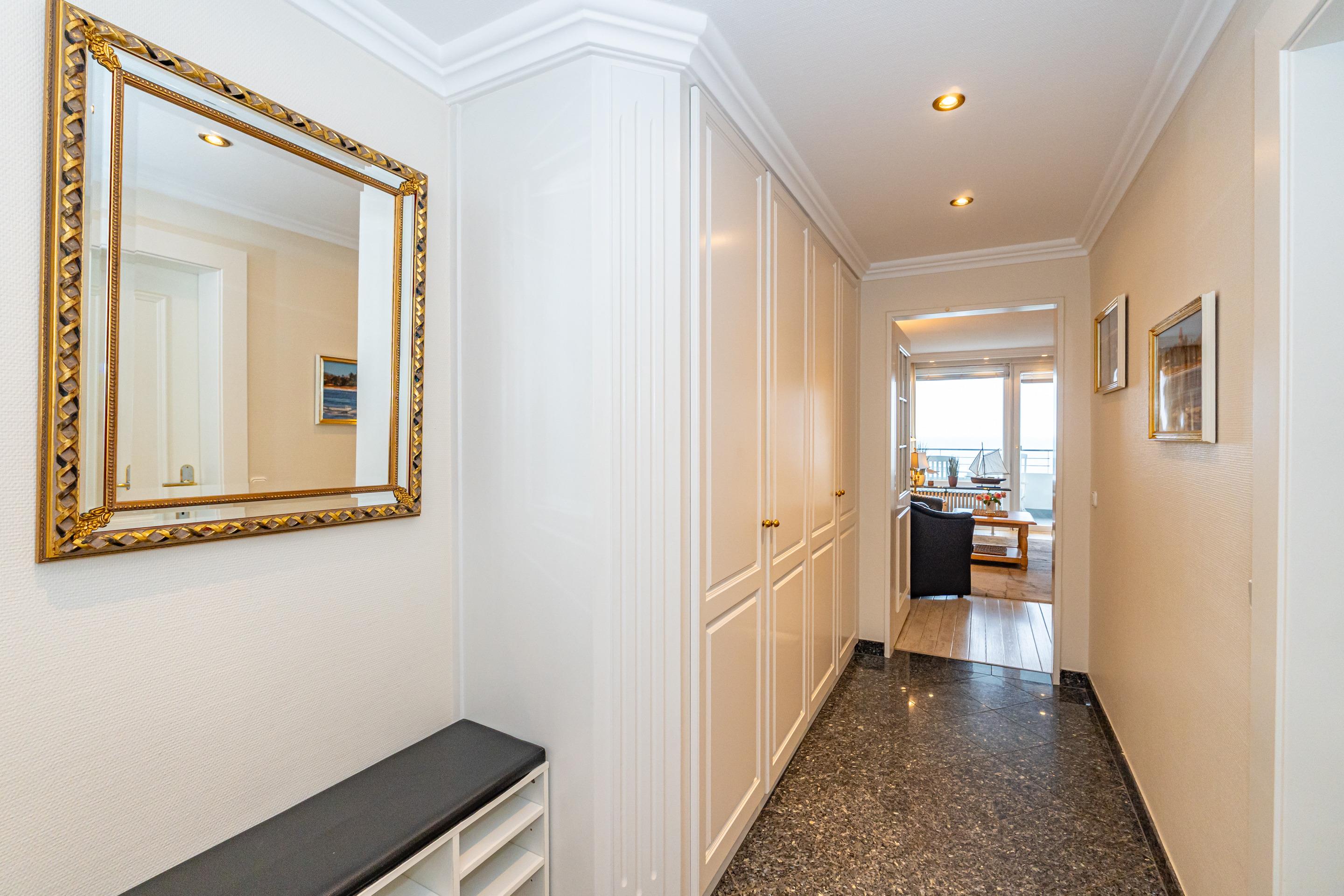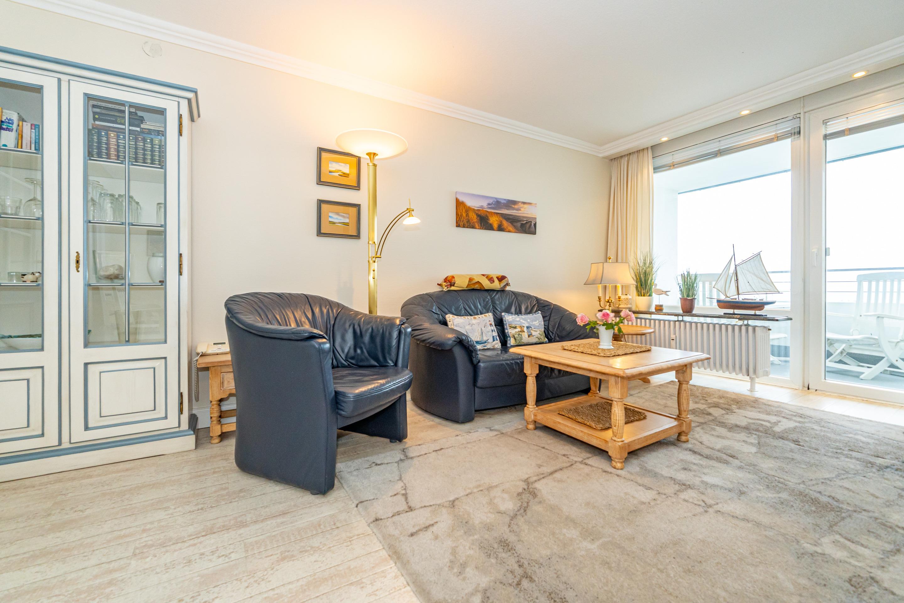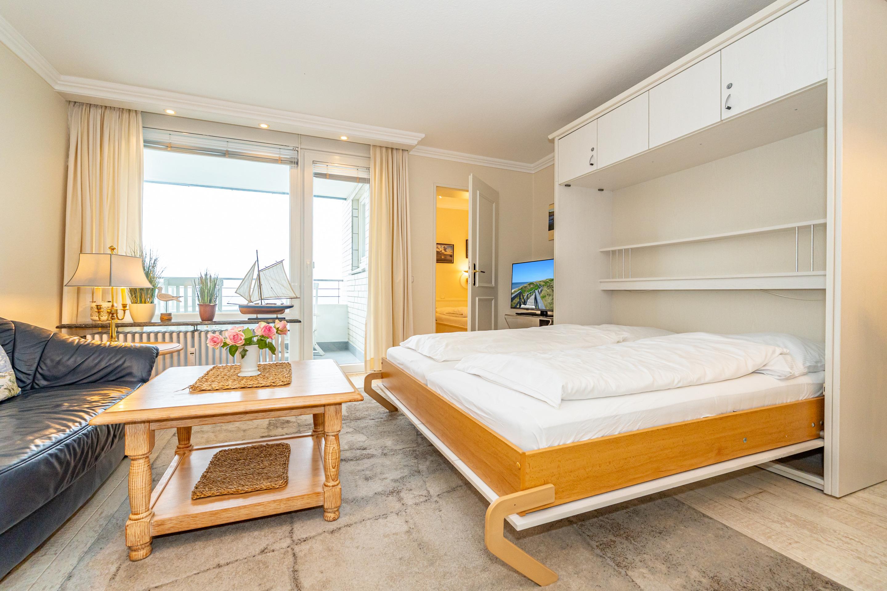 Exklusive 1,5-Zimmer-Nichtraucher-Ferienwohnung, ca. 48 qm, in der 6. Etage zur Seeseite mit herrlichem Meerblick und Westloggia (Nachmittagssonne, mit Balkonmöbeln und Auflagen) für max. 3 Personen.