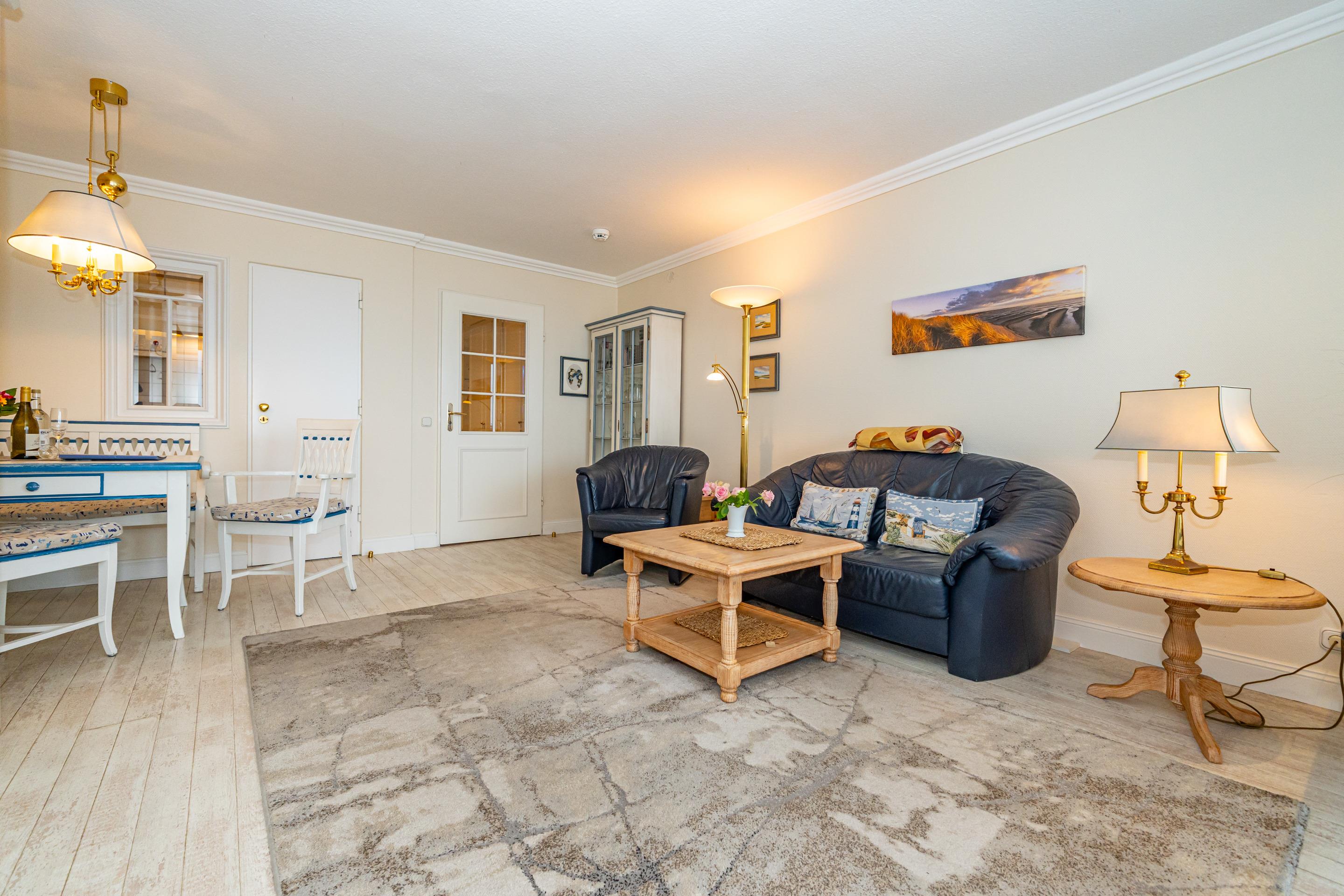 Der mit neuem, cremefarbenen Laminatboden ausgelegte Wohnraum besteht aus einer Sitzgarnitur (eine 2-Sitzer-Couch, ein Sessel), einem Essplatz, einem Doppelschrankbett (zusammen ausklappbar), 32 zoll Grundig LED Flatscreen-TV, Telefon mit kostenloser Telefonie ins deutsche Festnetz und W-Lan.