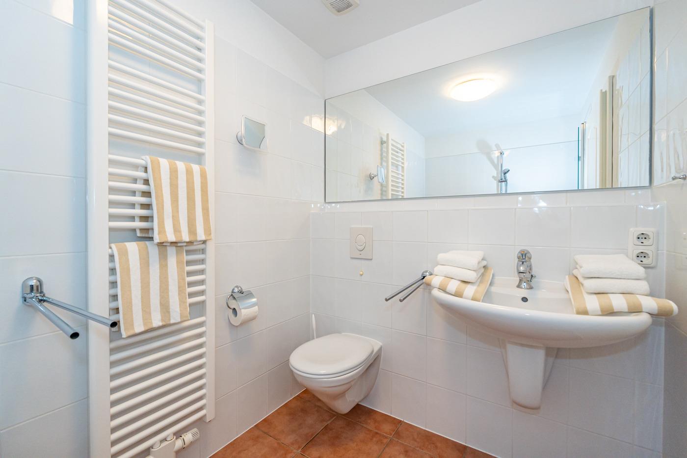 Das helle Badezimmer mit Fenster ist mit Dusche, Waschtisch, Handtuchtrockner, WC und Fön ausgestattet.