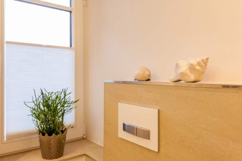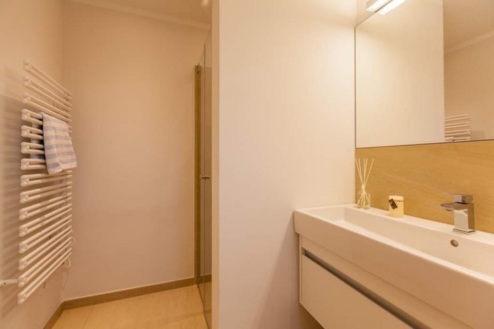 Das neue Bad lässt mit moderner Regendusche, Fön, Kosmetikspiegel, Waschtisch, Handtuchwärmer und WC keine Wünsche offen.