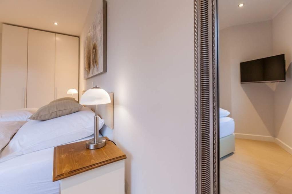 Vom Vorflur gelangt man außerdem in das geräumige Doppel-Schlafzimmer mit Boxspringbett (Einzelmatratzen 0,90 x 2,00 m) in optimaler Liegehöhe (Kinderzustellbett möglich) mit weiterem Flachbild-TV.
