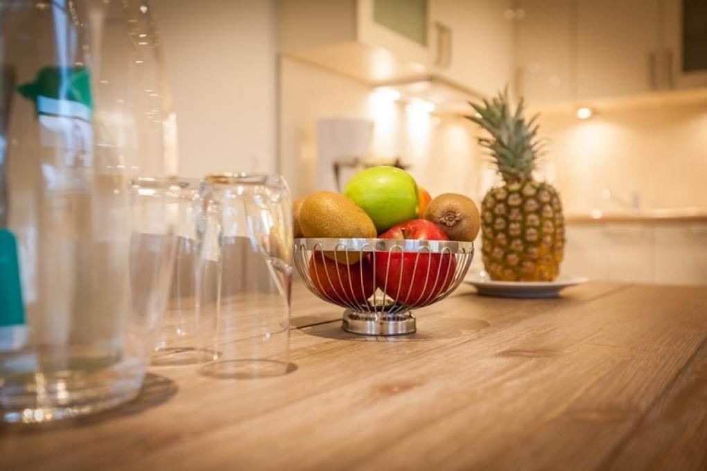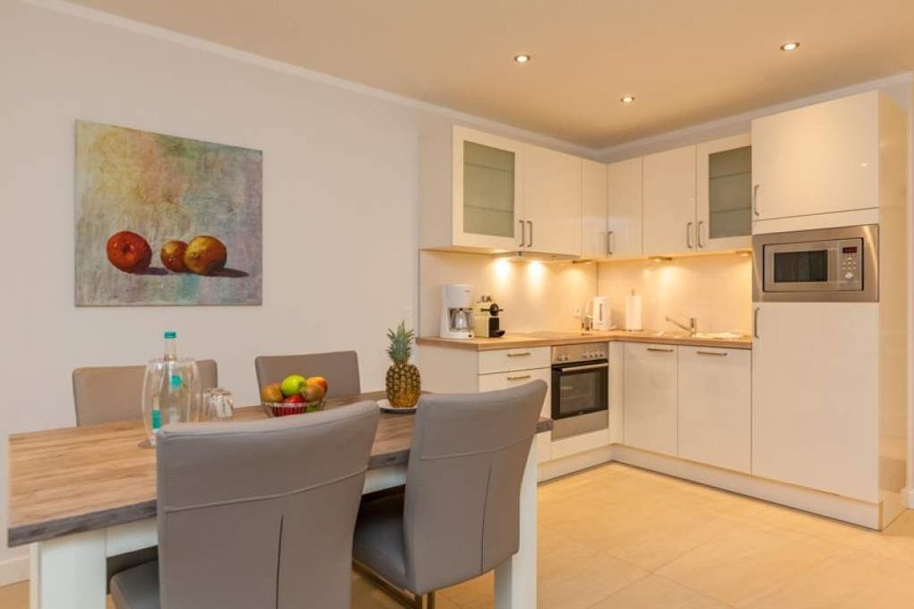 Die offene Küche ist mit Cerankochfeld, Geschirrspüler, Mikrowelle, Backofen, Kühlschrank, Nespresso-Maschine und einem Eierkocher voll ausgestattet. Toaster, Kaffeemaschine und Wasserkocher gehören zur Grundausstattung.