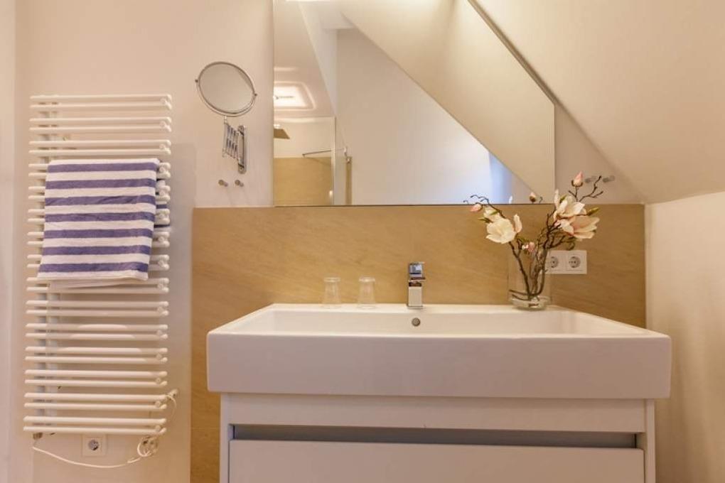 Auf der oberen Ebene, im Dachgeschoss, befinden sich ein Zweibett-Zimmer mit Boxspringbetten (0,90 x 2,00 m), Freiluftzugang zur Westloggia sowie ein Gäste-WC mit Waschbecken.