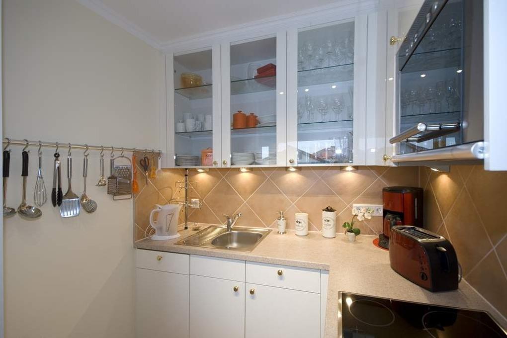 Die Küche hat einen Geschirrspüler, eine Mikrowelle mit Grillfunktion, ein Cerankochfeld und einen Kühlschrank. Kaffeemaschine, Wasserkocher und Toaster gehören zur Grundausstattung.