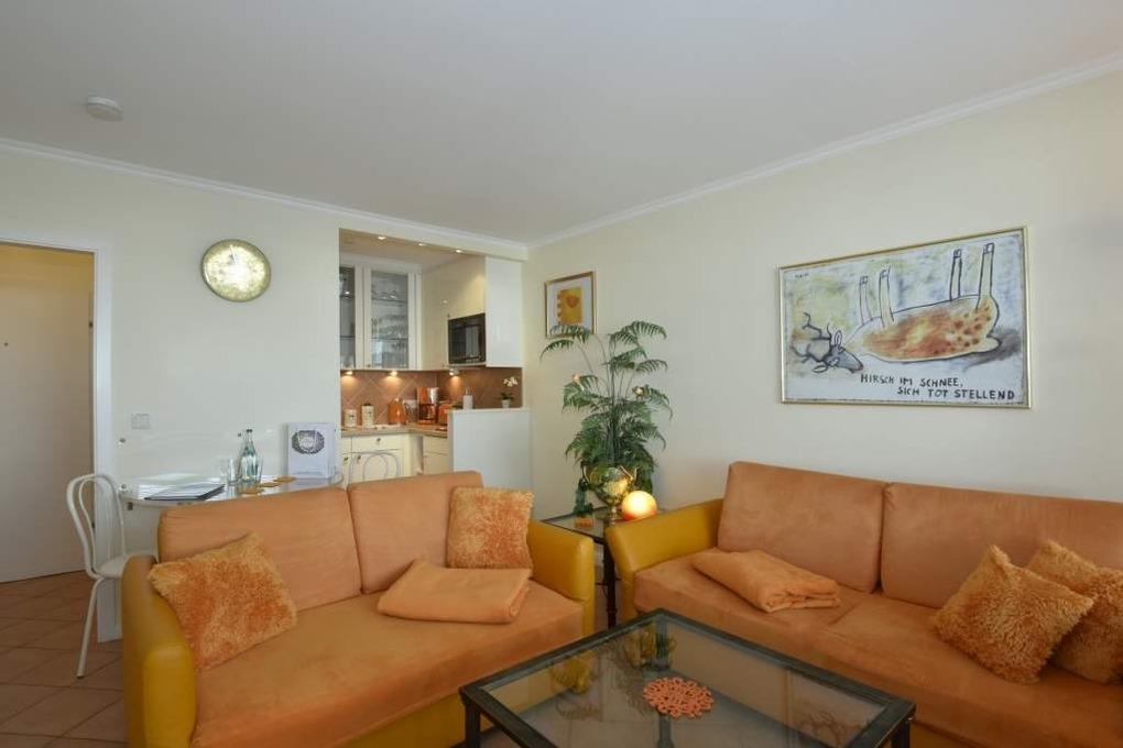 Im Wohnzimmer befinden sich zwei 2-Sitzer-Couchen, eine Essecke, Kabel-Flachbild-TV, iPod-Docking-Station, DSL-Anschluss mit W-Lan, Nordbalkon mit Heizstrahler (0,50 €/30 Min.).