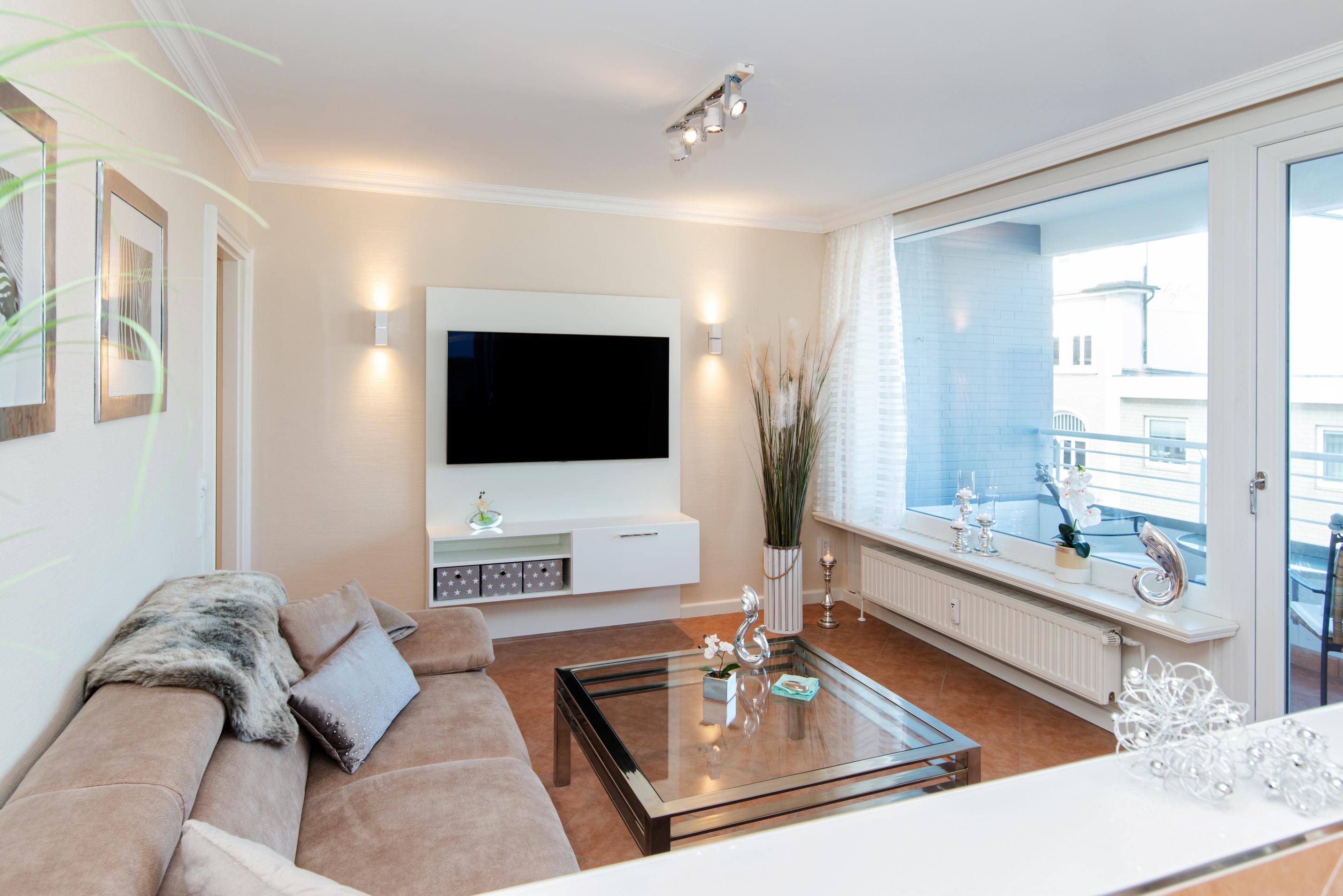 Im hellen Wohnzimmer befindet ein gemütliches Ecksofa, ein großer Kabel-Flachbild-TV, die offene XL-Einbauküche mit separatem Essplatz (Hochtisch mit stylischen Tresenstühlen) vor breiter Fensterfront und der Zutritt zur Nordostloggia.