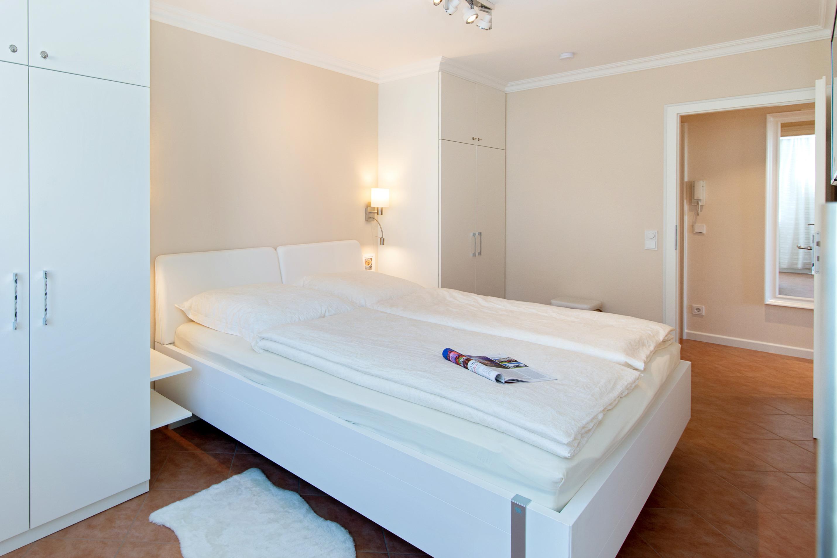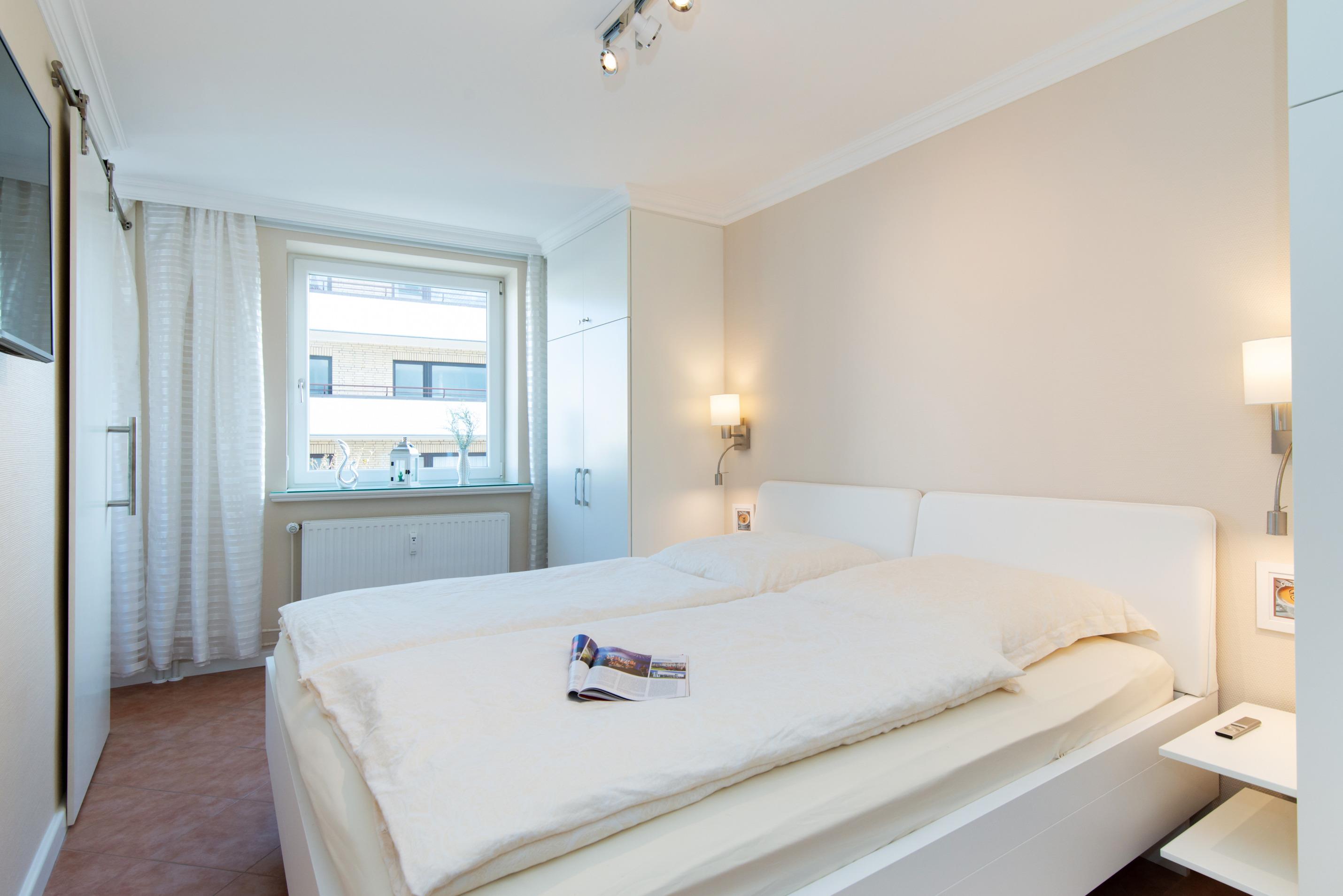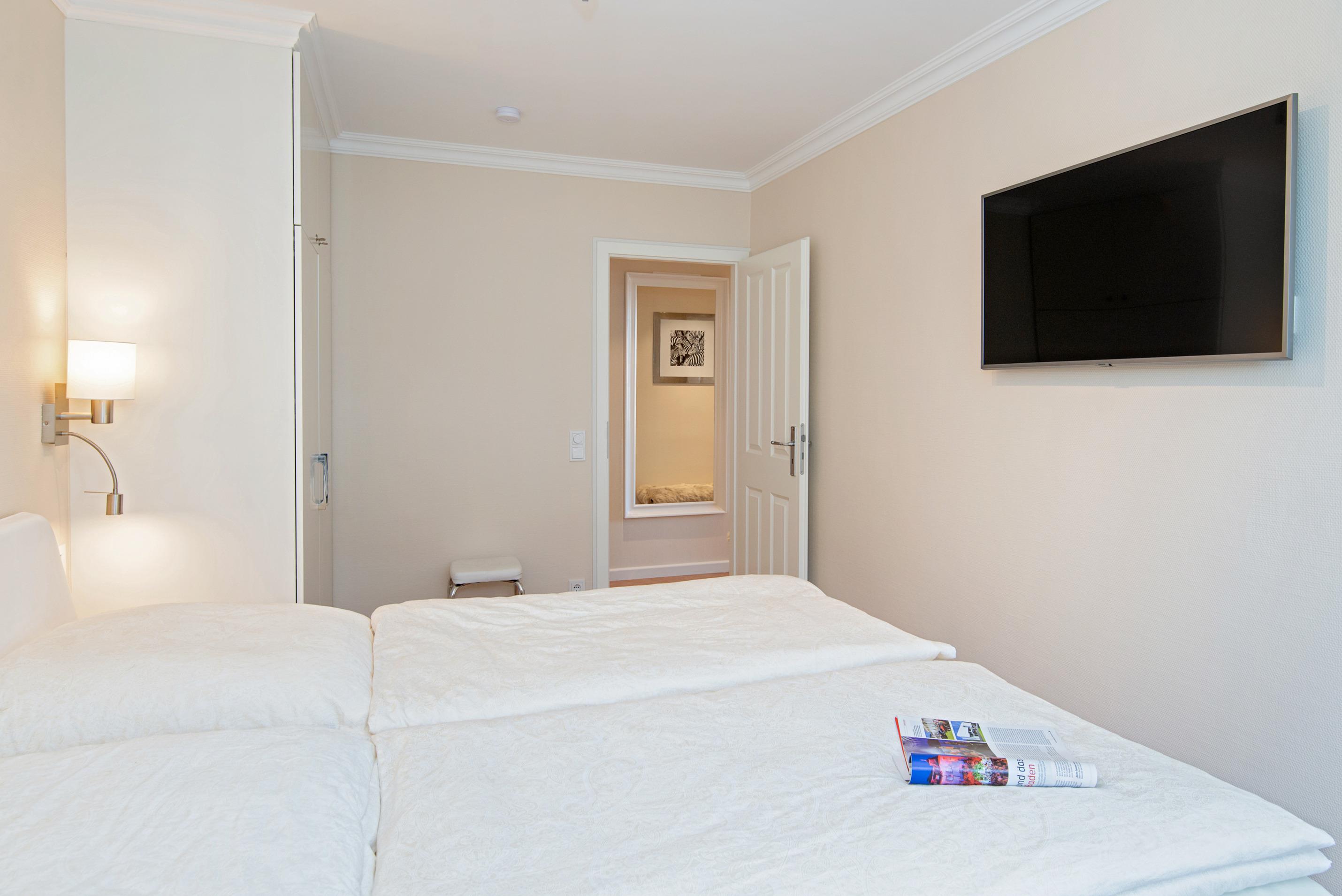 Das von der Küche und der Diele aus begehbare Schlafzimmer ist mit einem guten Doppelbett (2 Einzelmatratzen, jeweils 2 m x 0,90 m) und einem weiteren Kabel-Flachbild-TV (Wandmontage) ausgestattet.