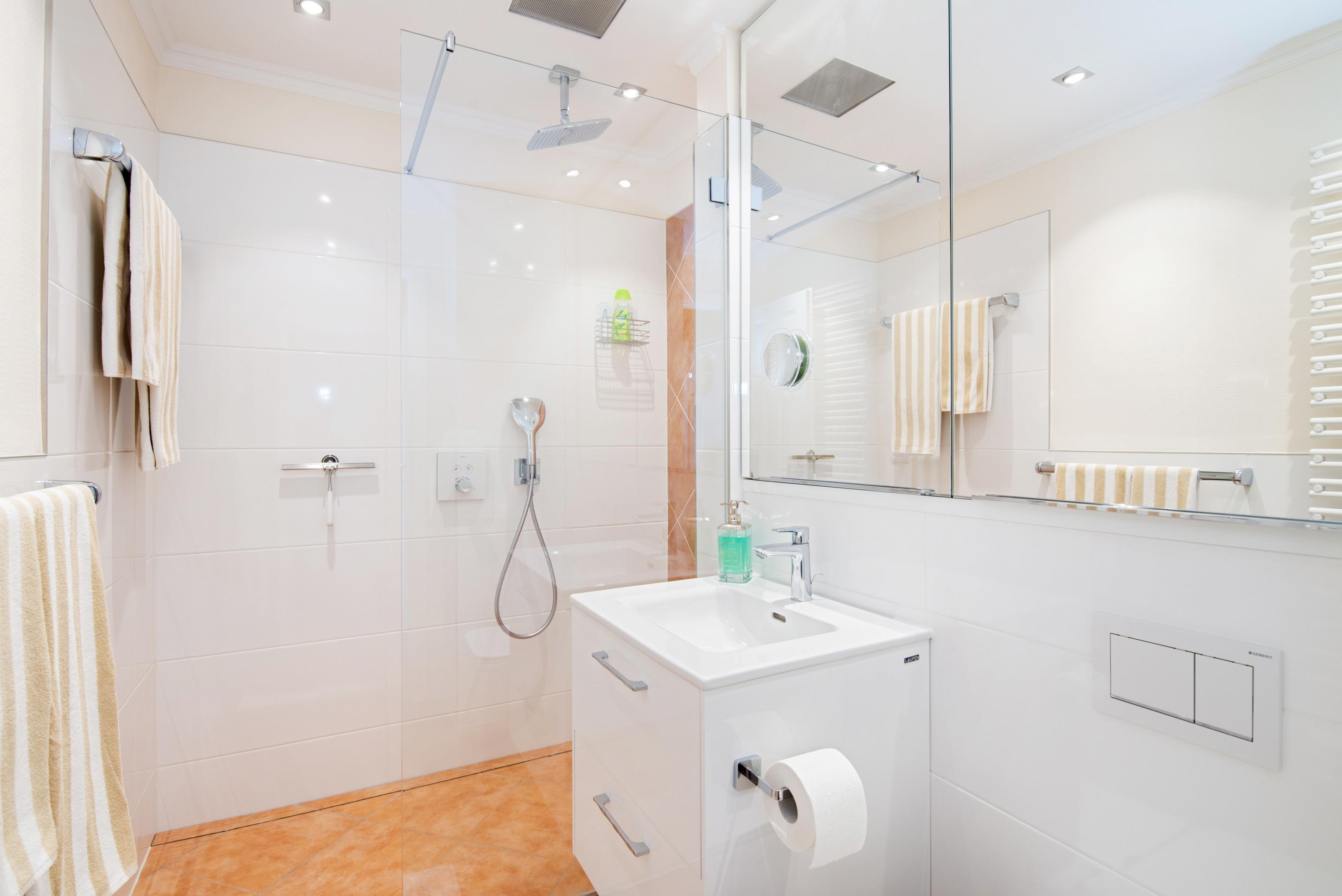 Im neuen Badezimmer mit Fußbodenerwärmung befindet sich eine großzügige Dusche mit extraflachem Einstieg, Handtuchtrockner, Waschtisch und WC.
