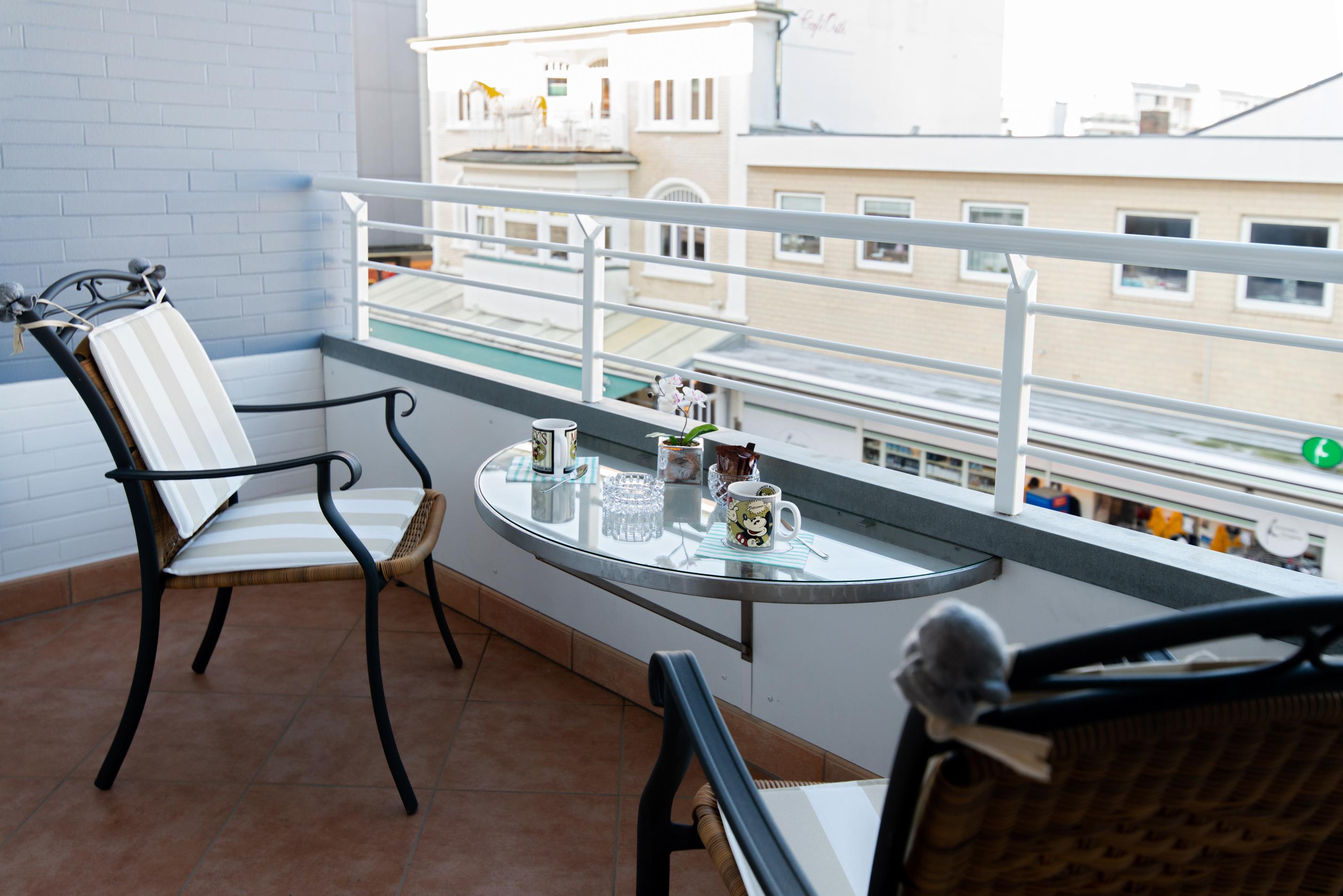 Auf der Loggia stehen Balkonmöbel mit Auflagen zur Verfügung.