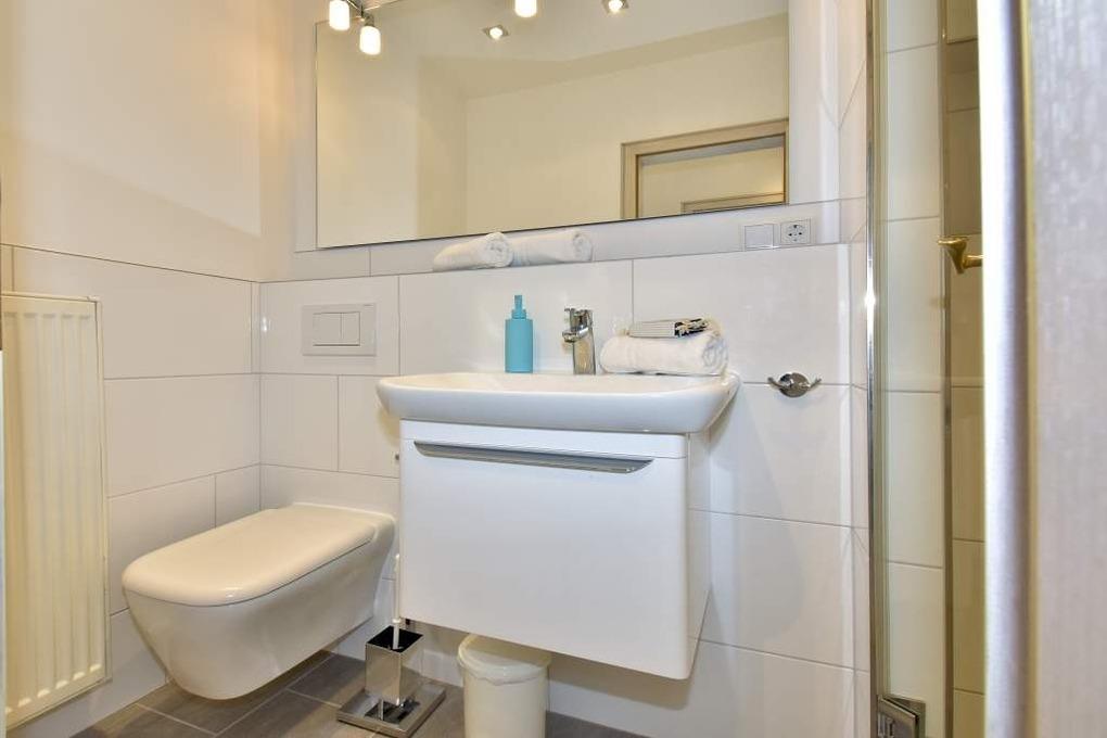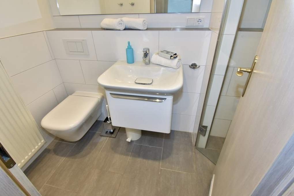 Das neue Badezimmer ist mit Waschtisch, Dusche mit extraflachem Einstieg und WC ausgestattet.