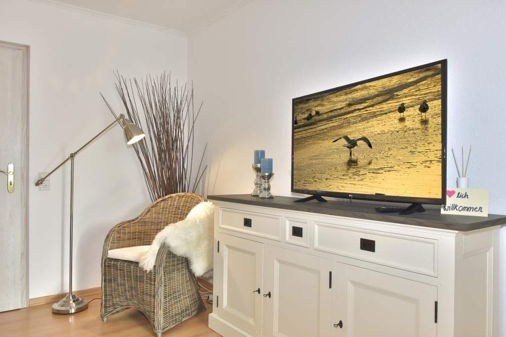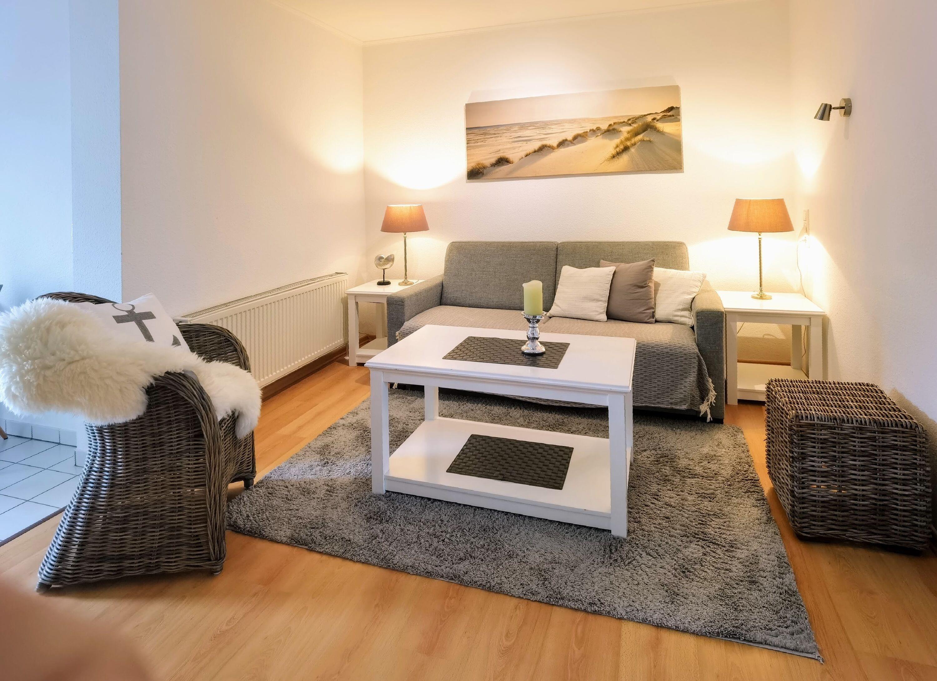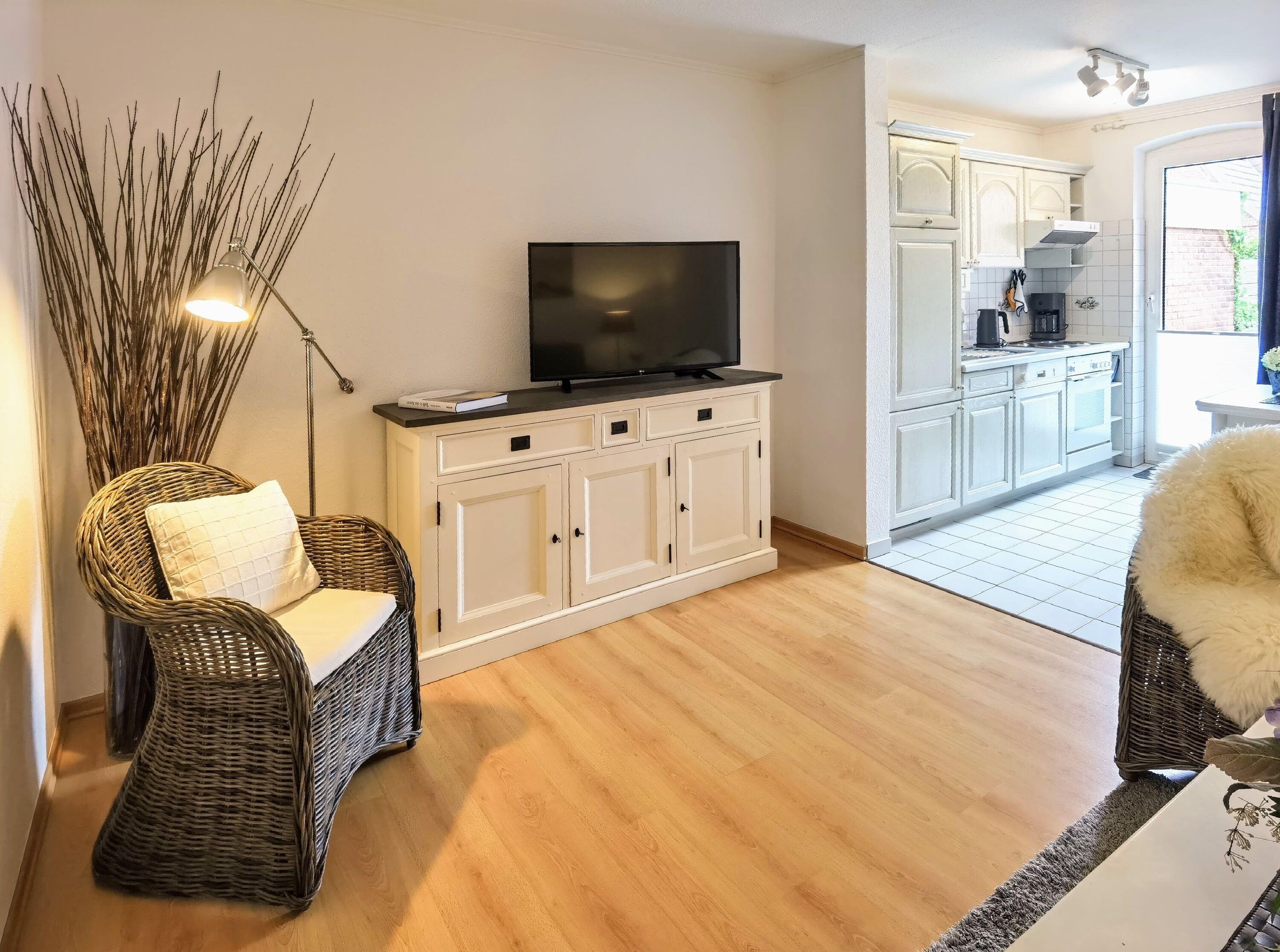 Das gemütliche Wohnzimmer hat eine Schlafcouch, 2 Korbsessel und einen Flachbild-TV. Vom Wohnzimmer gelangt man in die helle offene Küche und hat Zugang zu der nach Süden ausgerichteten Terrasse.