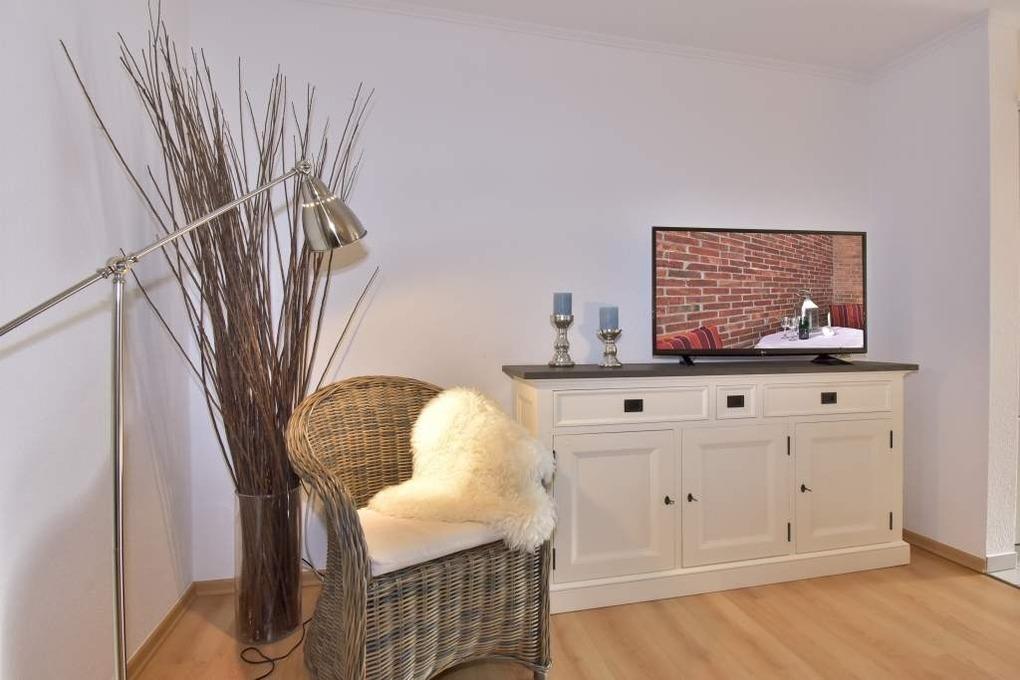 2-Zimmer-Nichtraucher-Ferienwohnung, ca. 50 qm, im EG mit Südterrasse (mit Terrassenmöbeln und Auflagen und Saison-Strandkorb) für max. 3 Personen.