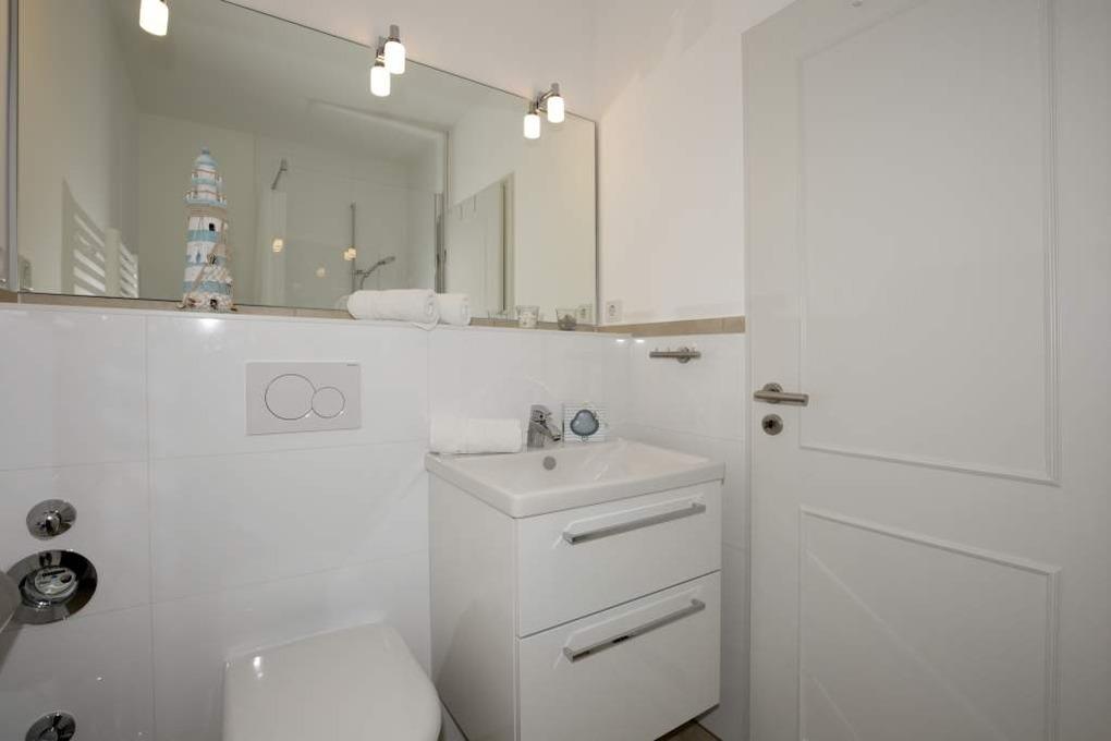 Das Bad verfügt über eine Dusche, ein WC und einen Waschtisch.