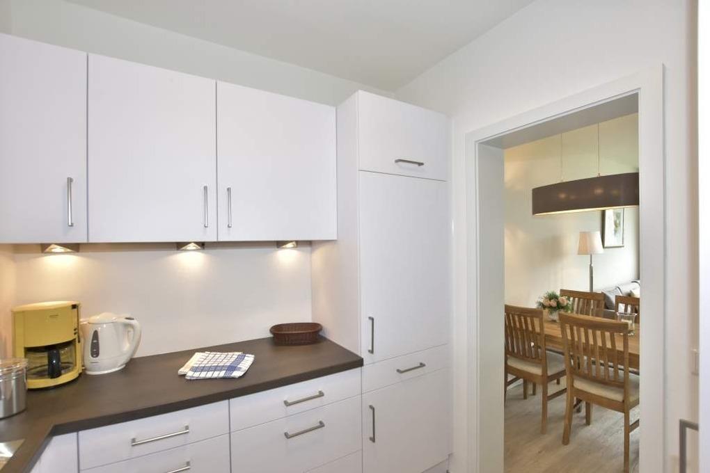 Die helle Küche hat einen Geschirrspüler, ein 4-Platten-Ceranfeld mit Backofen und einen Kühlschrank mit 3-Sterne-Gefrierfach. Kaffeemaschine, Wasserkocher und Toaster gehören zur Grundausstattung.