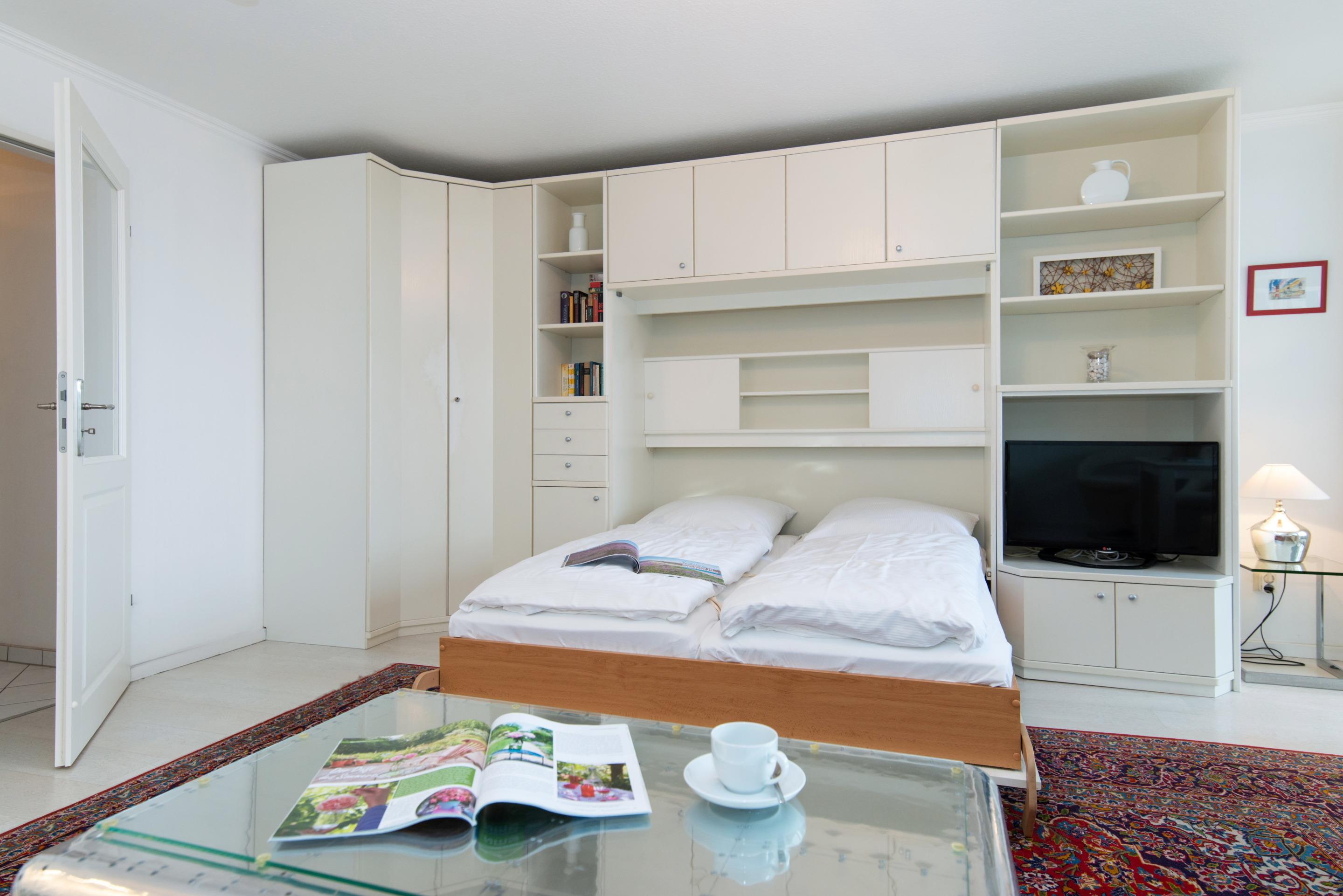 Der kombinierte Wohn-/Schlafraum besteht aus einer gemütlichen Sitzgarnitur (2-Sitzer-Couch), Doppelschrankbett (mit getrennten Matratzen, im Ganzen klappbar), Essplatz, Kabel-Flachbild-TV.