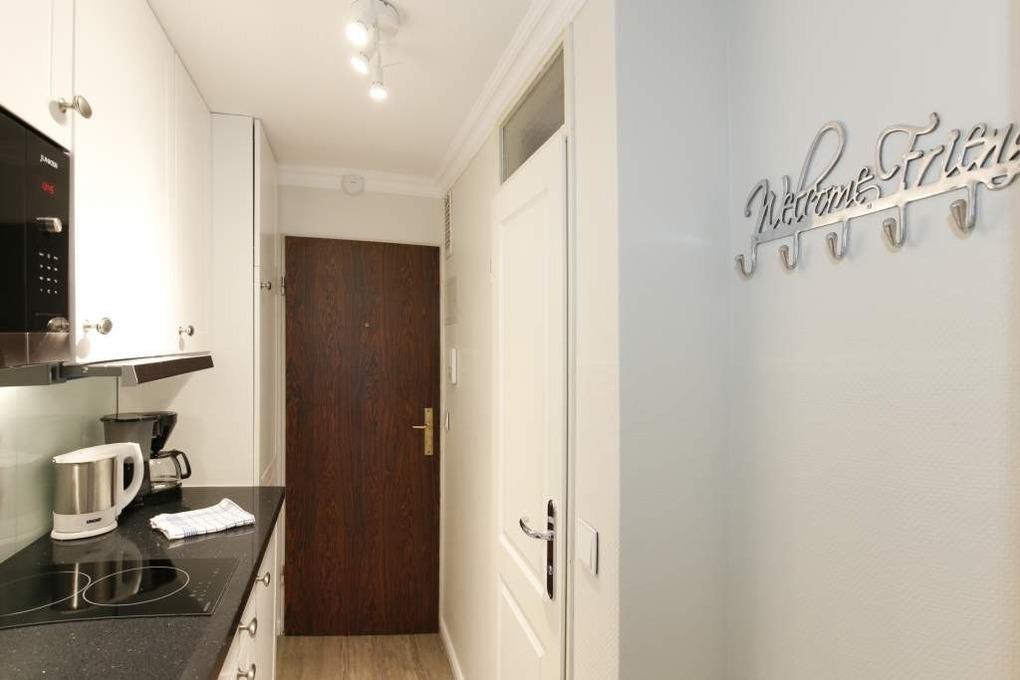 Die moderne Küchenzeile hat einen Geschirrspüler, eine Mikrowelle, ein Ceranfeld mit zwei Kochfeldern und ein Kühlschrank. Kaffeemaschine, Wasserkocher und Toaster gehören zur Grundausstattung.