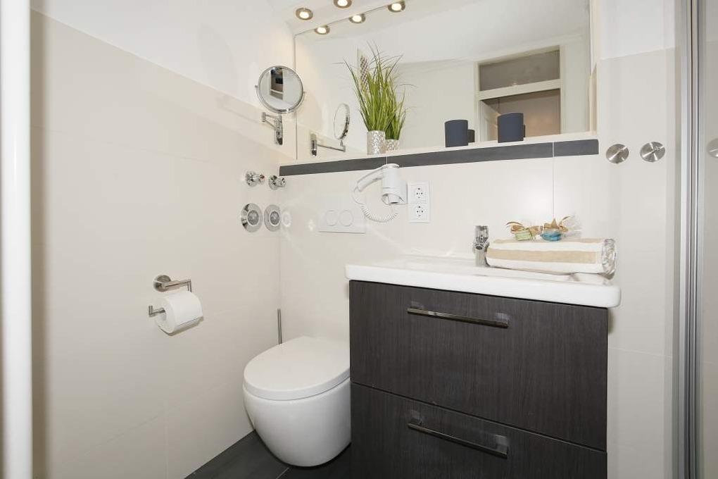 Im hellen, freundlichen Bad befinden sich eine Dusche, ein WC und ein Waschtisch.
