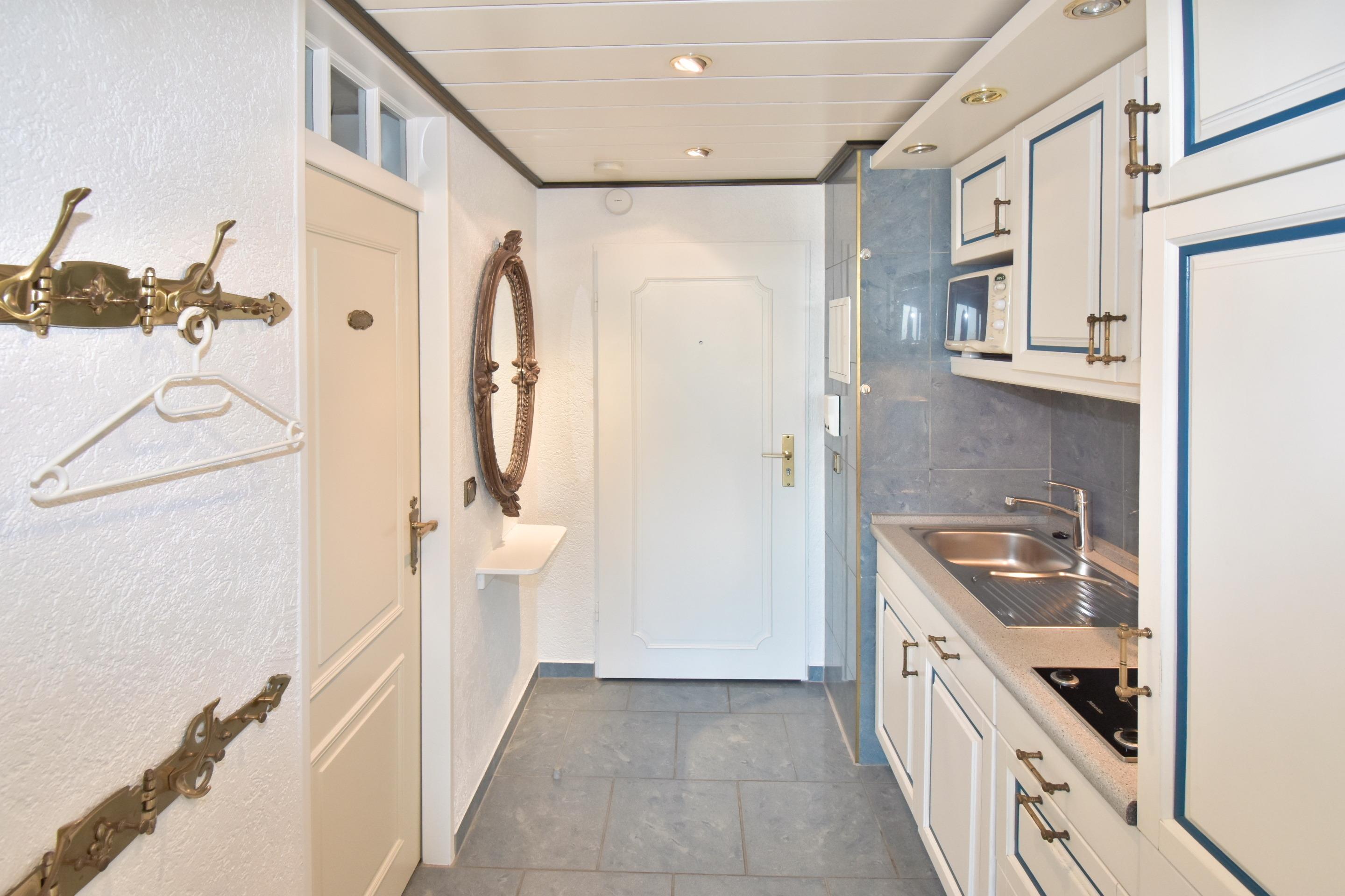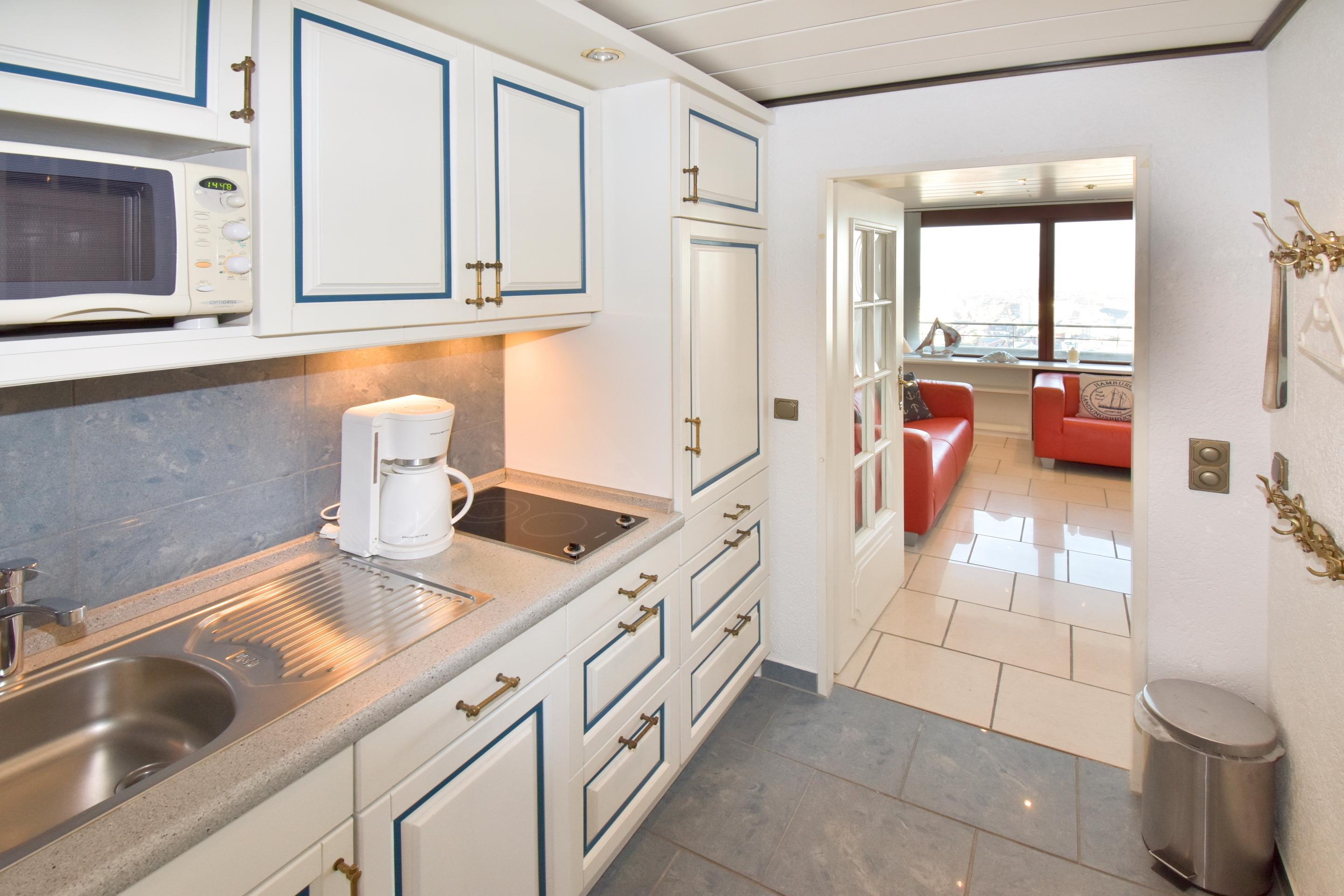 Die offene Küche ist mit einem 2-Platten-Ceranfeld, einer Mikrowelle, einem Kühlschrank, einem Eierkocher und einem Stabmixer gut ausgestattet. Kaffeemaschine, Wasserkocher und Toaster gehören ebenfalls zur Grundausstattung.