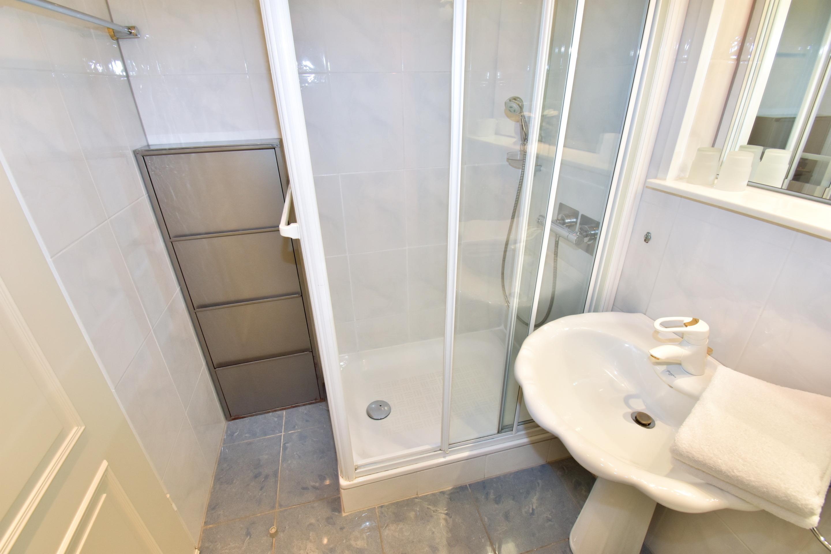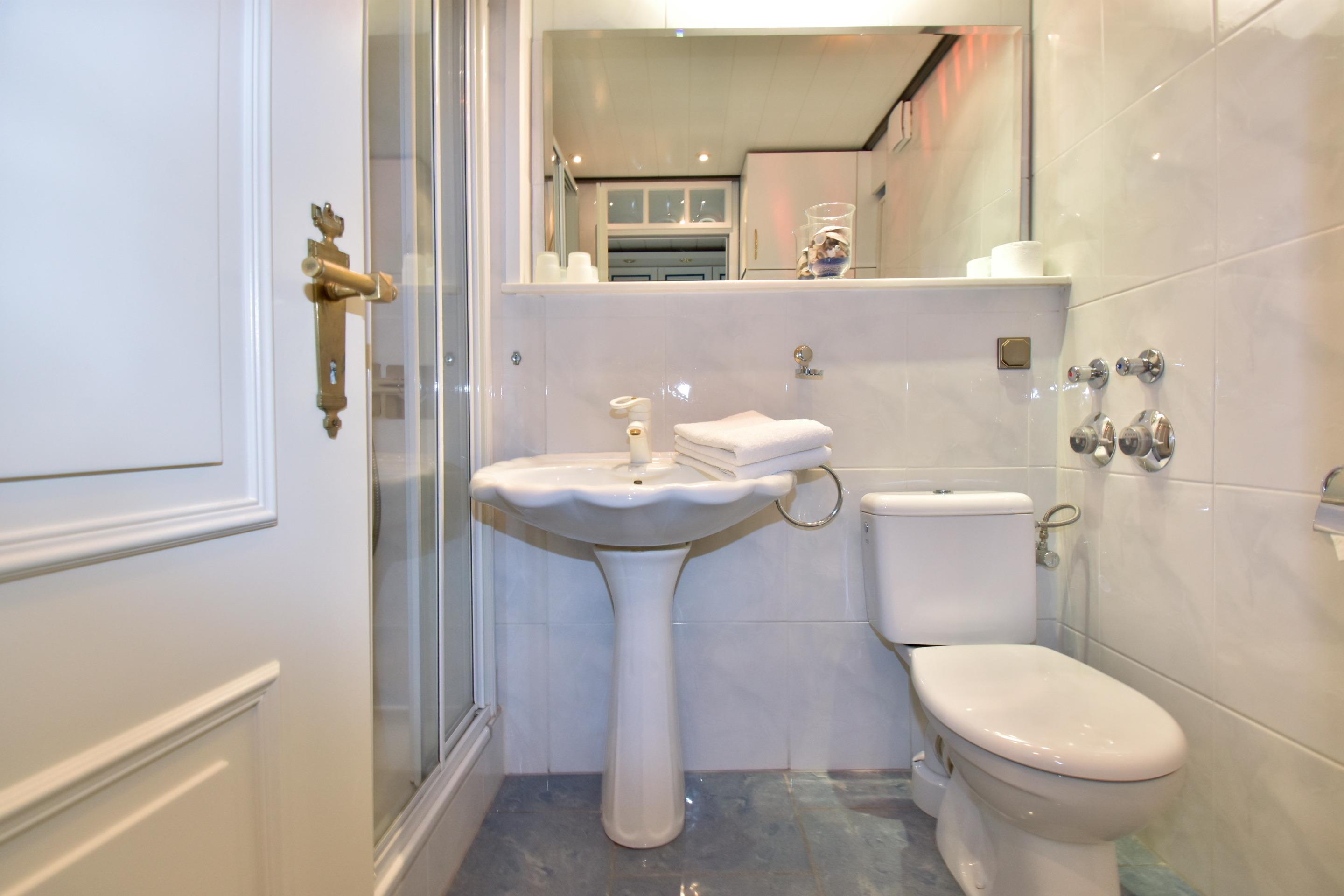 Das Duschbad ist ausgestattet mit einer Dusche, einem Waschtisch und einem WC.