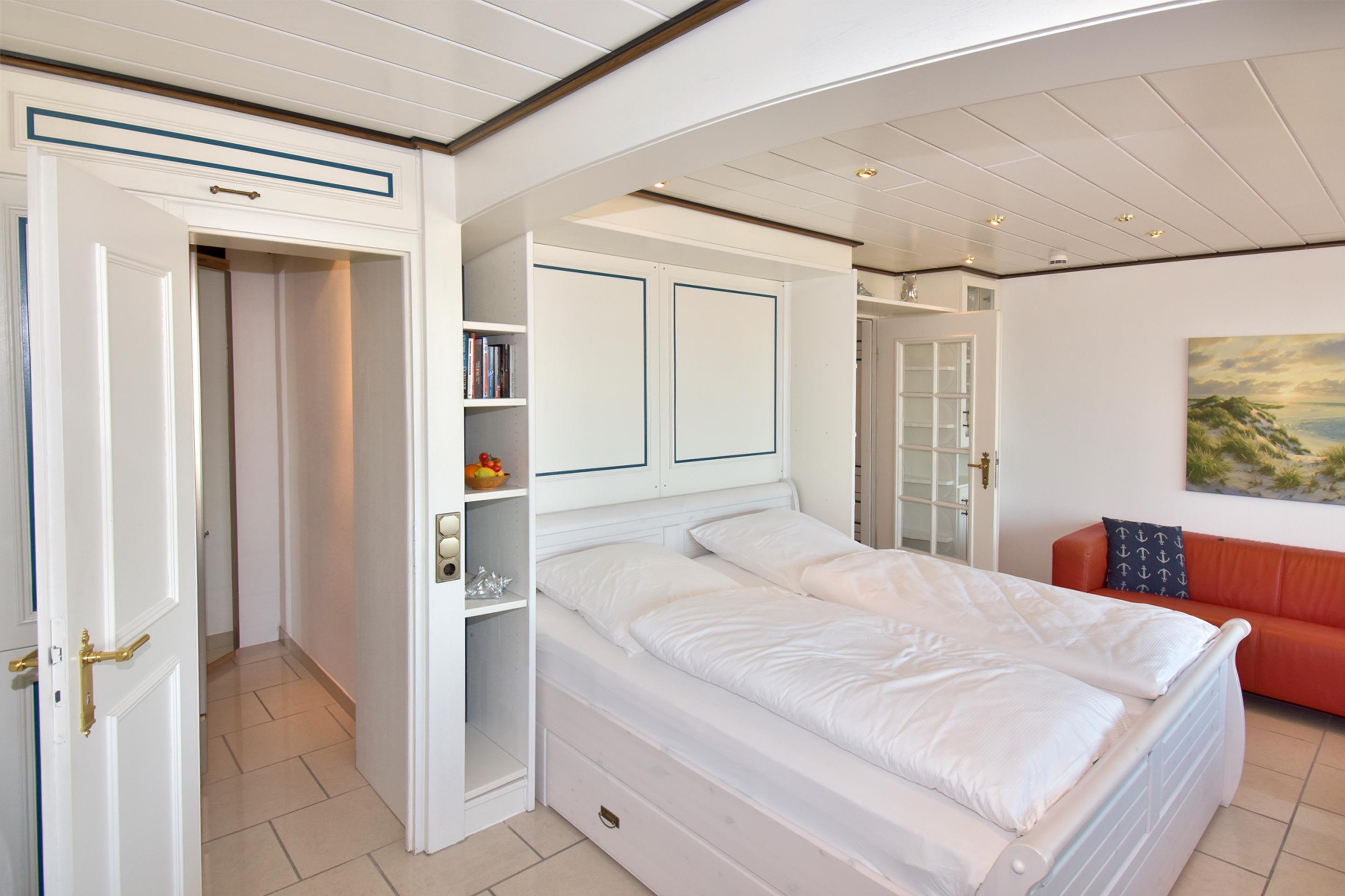 Im hellen Wohn- und Schlafbereich sorgt ein fest installiertes Doppelbett (0,90 x 2,00m - bestehend aus zwei Einzelmatratzen), für erholsame Nächte. Eine stilvolle, rote Leder-Couchgarnitur, ein separater Essplatz direkt am Fenster, ein großer Flachbildfernseher, sowie ein begehbarer Kleiderschrank runden das Ambiente perfekt ab. Der direkte Zugang zum Ostbalkon ermöglicht zusätzlichen Raum für entspannte Stunden.