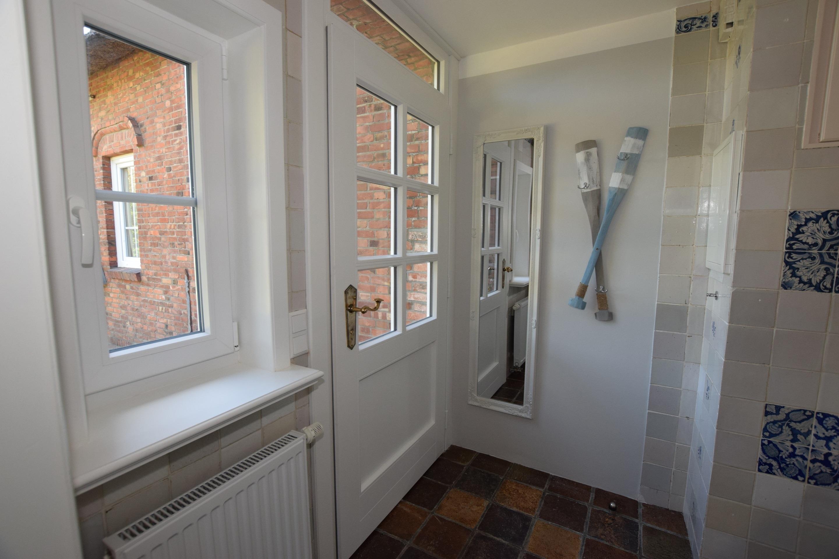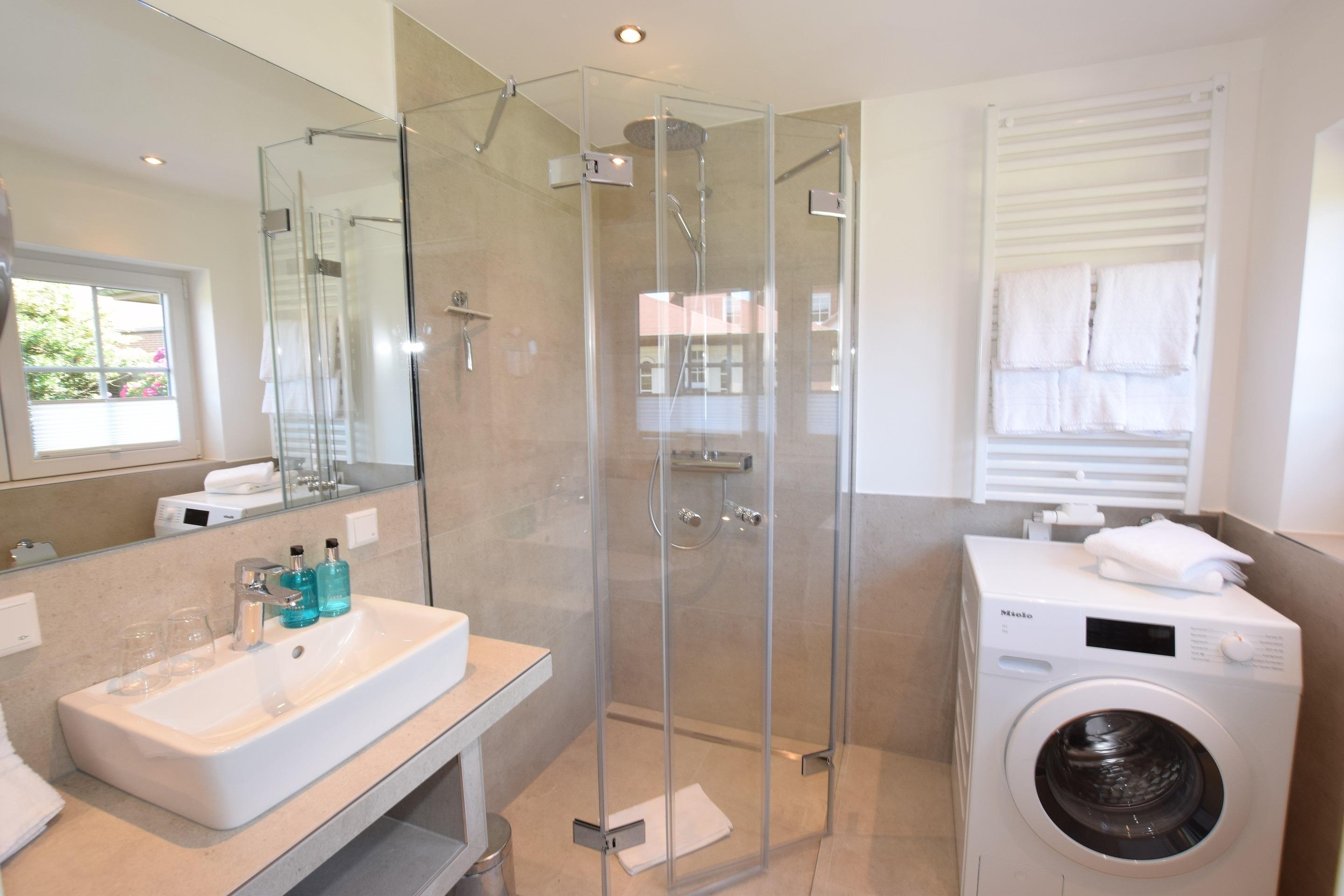 Das moderne und neue Duschbad/WC mit ebenerdiger Dusche, Waschtisch, Handtuchtrockner, beleuchteten Kosmetikspiegel, Haartrockner, WC und Waschmaschine mit Fenster ist perfekt für einen Start in einen entspannten Urlaubstag.