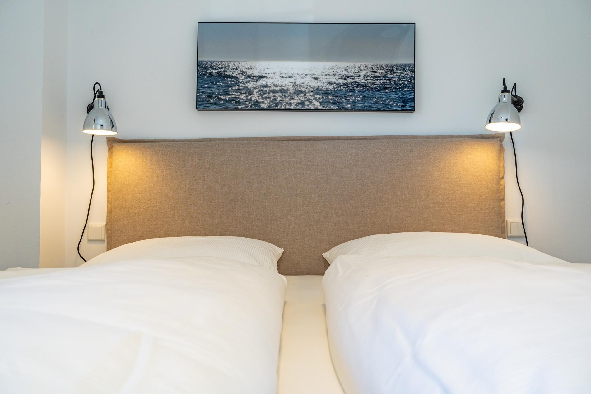 Das Schlafzimmer ist mit einem guten Boxspring-Doppelbett (Überlänge, zwei Einzelmatratzen je 0,90 x 2,10 m, mit durchgehendem Topper), Kleiderschrank und weiterem Flachbild-TV eingerichtet.