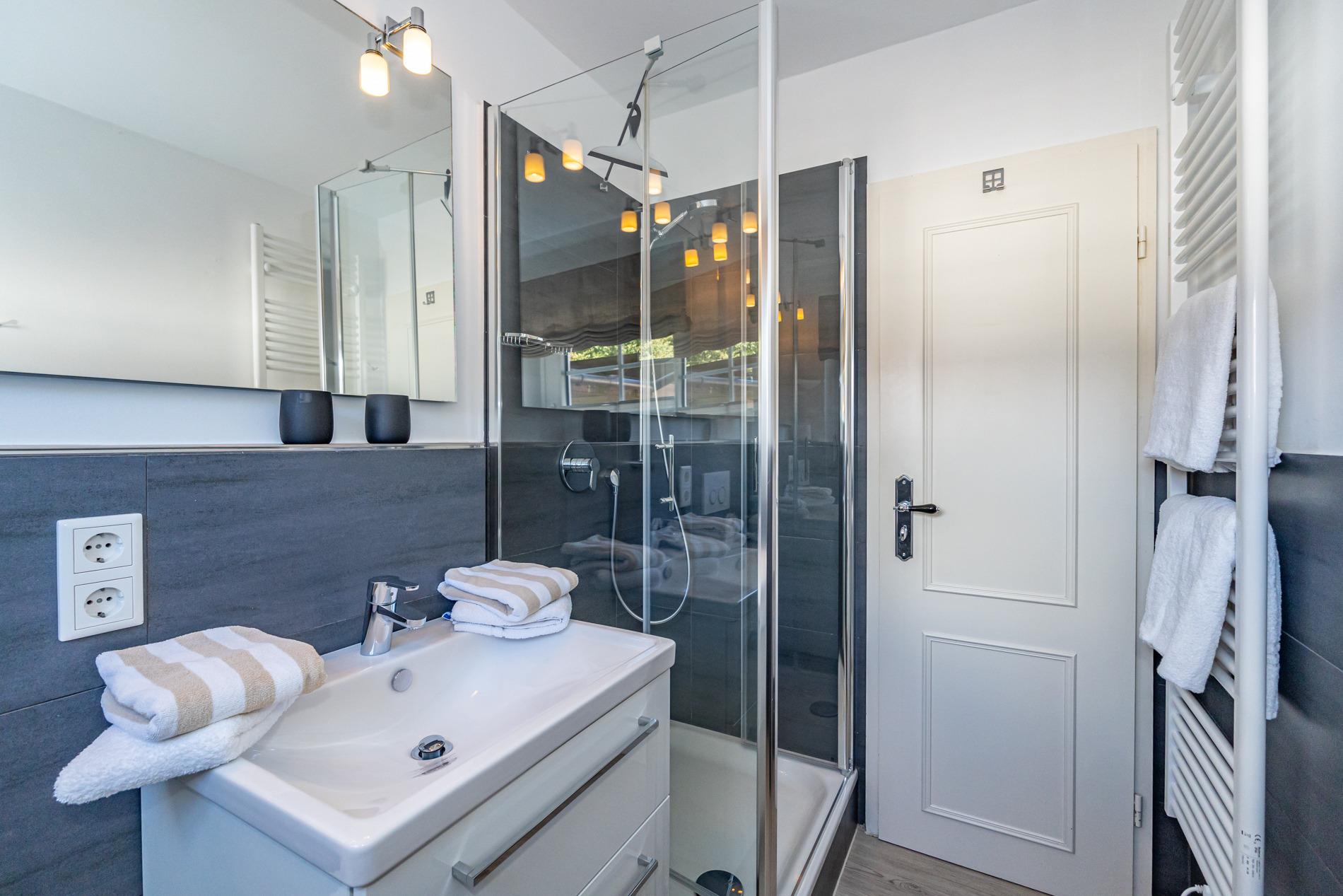 Das Badezimmer mit Fenster ist mit einer Dusche, Waschtisch, Handtuchtrockner, Fön und WC ausgestattet.