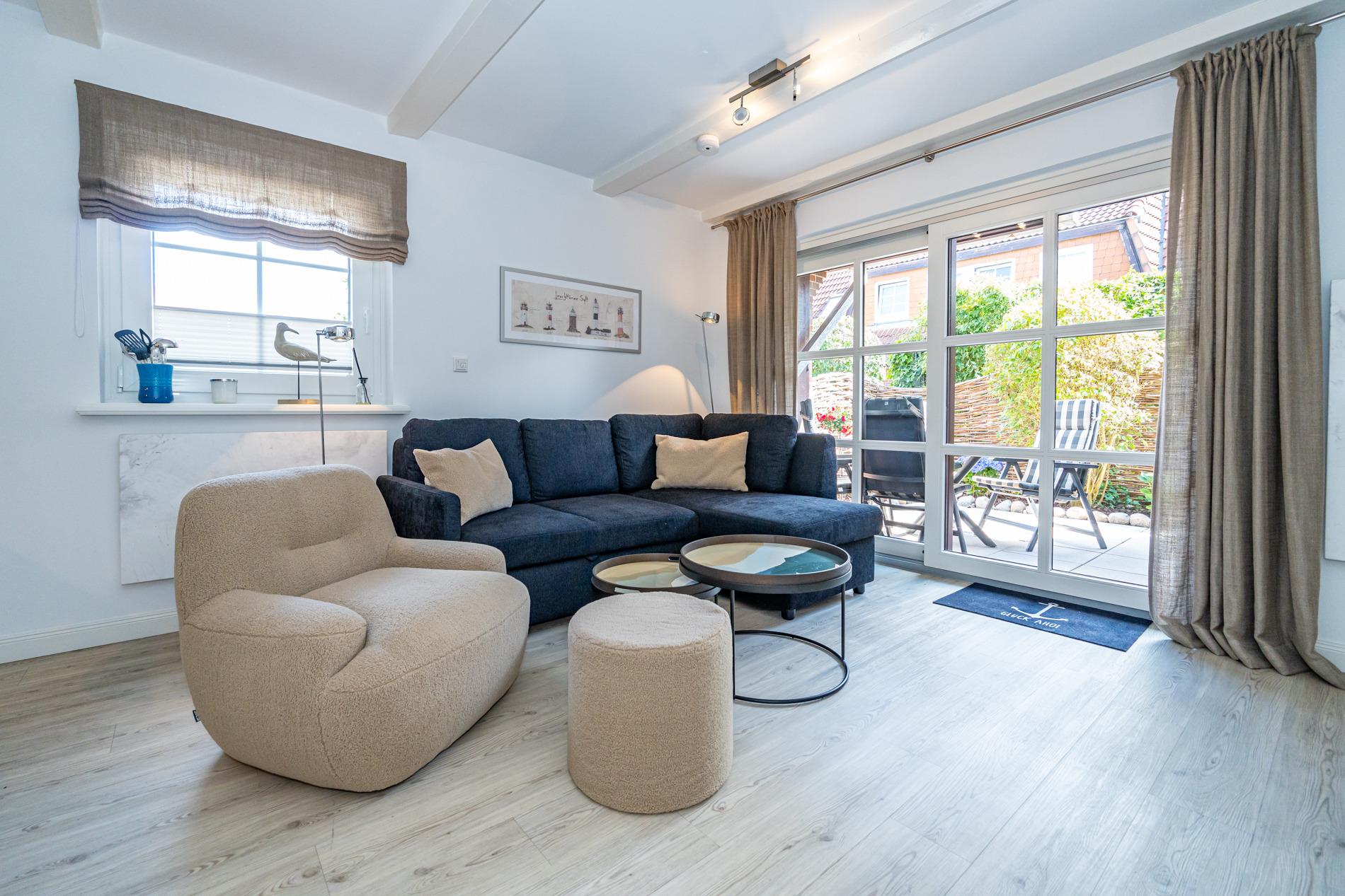 Hochwertig ausgestattete und exklusive 2-Zimmer-Nichtraucher-Ferienwohnung, ca. 45 qm im Parterre zur Südseite mit Südterrasse (mit Balkonmöbeln, Armlehnstühlen + Auflagen, Terrassentisch, Sonnenschirm + Ständer ) und Abstellraum auf der Terrasse für max. 2 Personen.