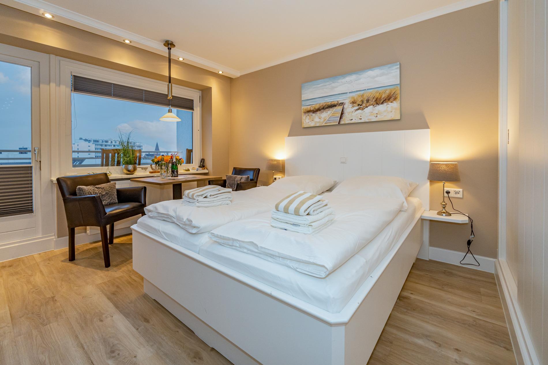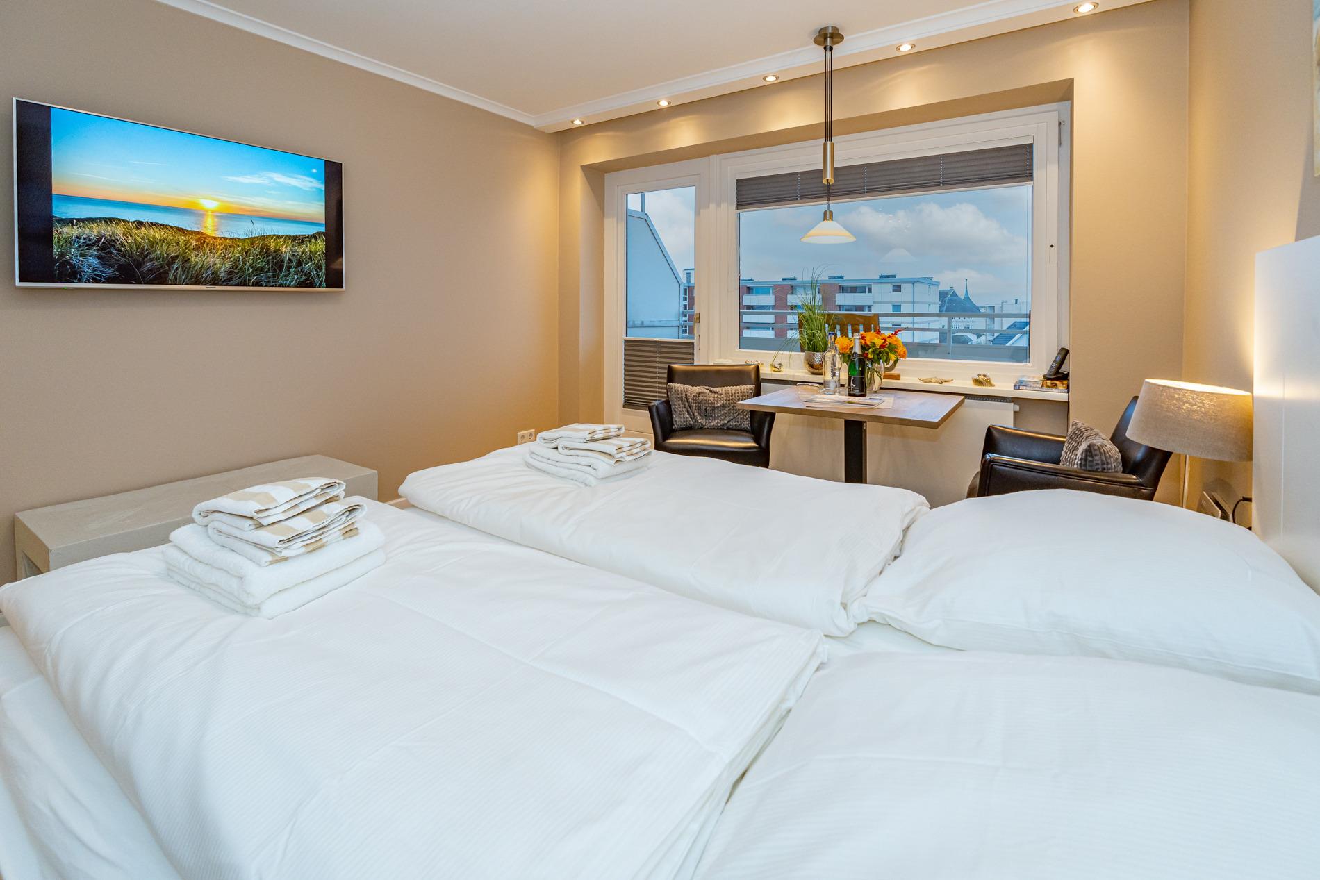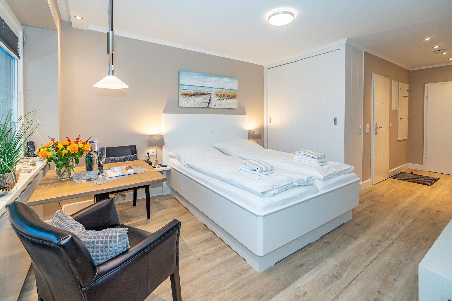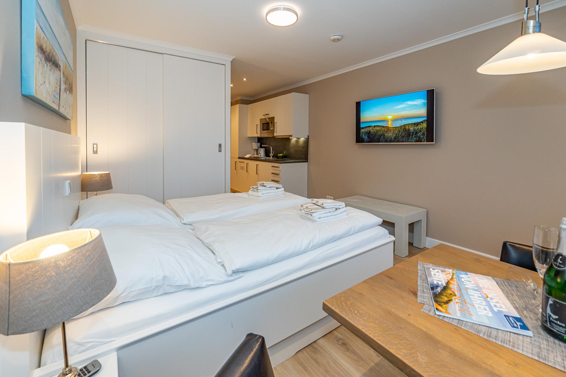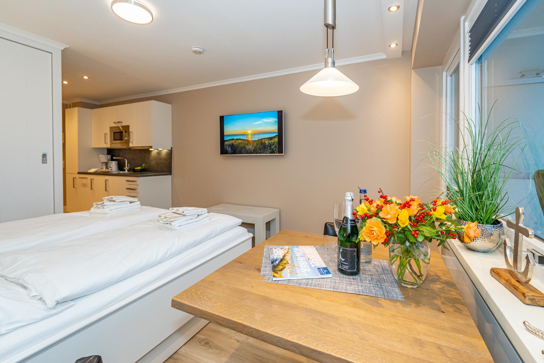 Aufwendig renovierte 1-Zimmer-Nichtraucher-Ferienwohnung mit modernem Designerboden in Holzoptik, ca. 24 qm in der 4. Etage (Fahrstuhl im Haus) zur Ostseite mit weitem Blick über Westerland. Kombinieter Wohn/Schlafraum mit feststehendem Tischler-Doppelbett (Liegefläche 1,60 x 2m, mit guten Einzelmatratzen), großer Flachbild-TV, Kleiderschrank, Essplatz am Fenster mit 2 bequemen Stühlen, WLAN und kostenlose Telefonie ins deutsche Festnetz (Handynummern gesperrt), offene neue Einbau-Küchenzeile mit Mikrowelle, Nespresso-Maschine, Ceranfeld (2 Kochfelder) und Spülmaschine. Kaffeemaschine, Wasserkocher und Toaster gehören zur Grundausstattung, Neues Duschbad/WC, Ostbalkon mit Balkonmöbeln (Hochlehner) und Auflagen (Morgensonne).