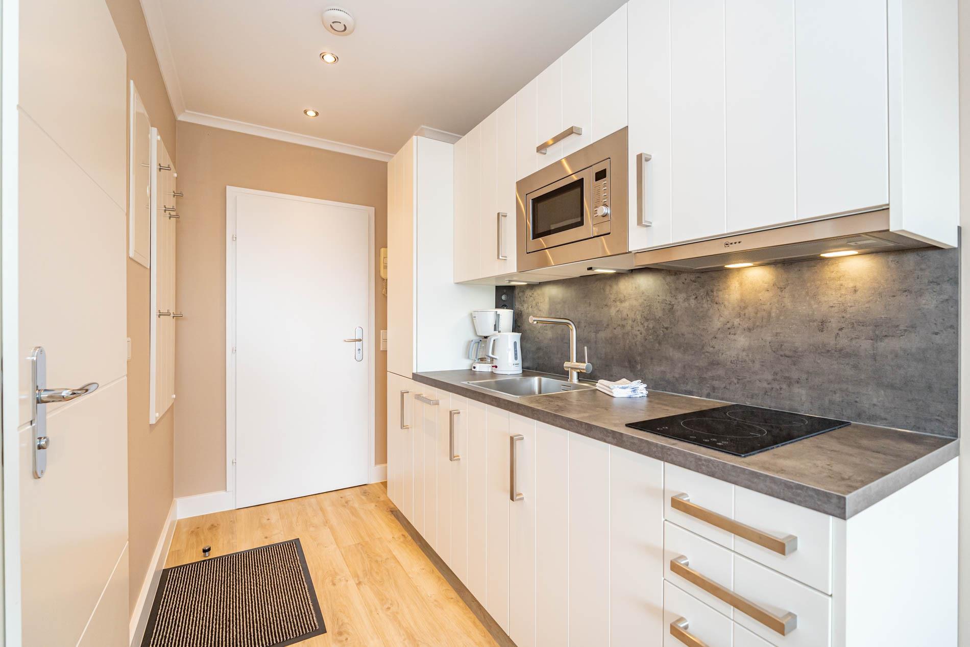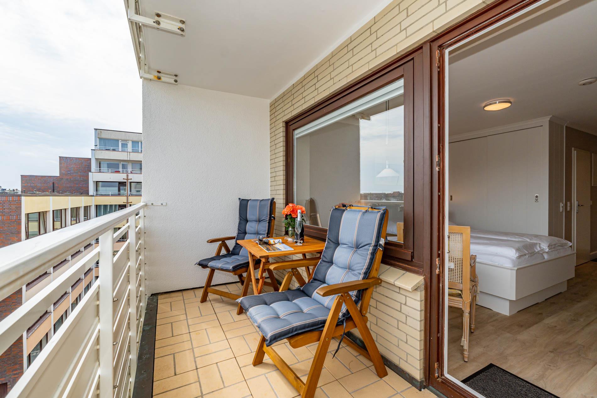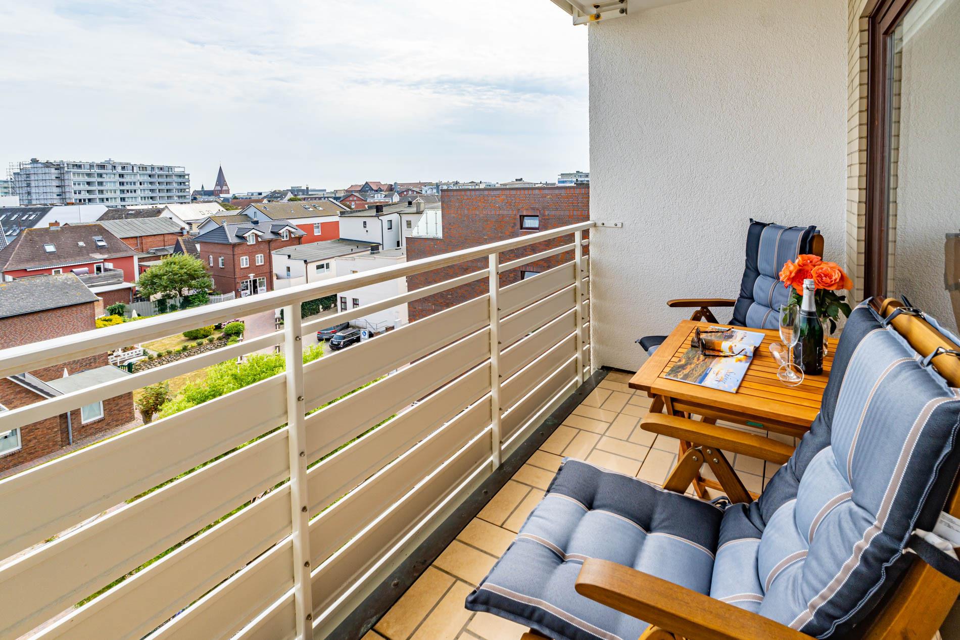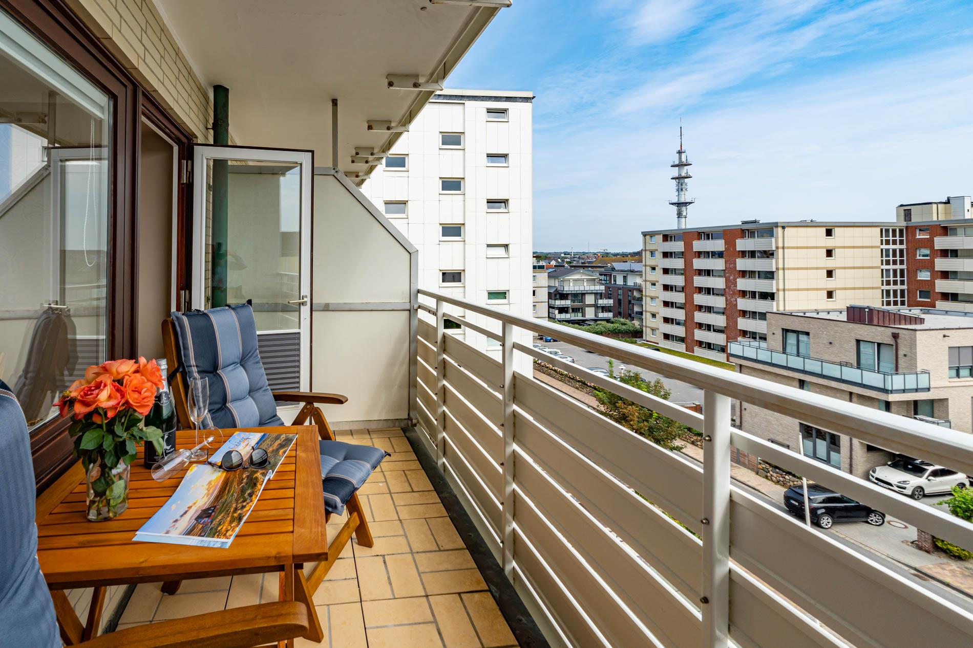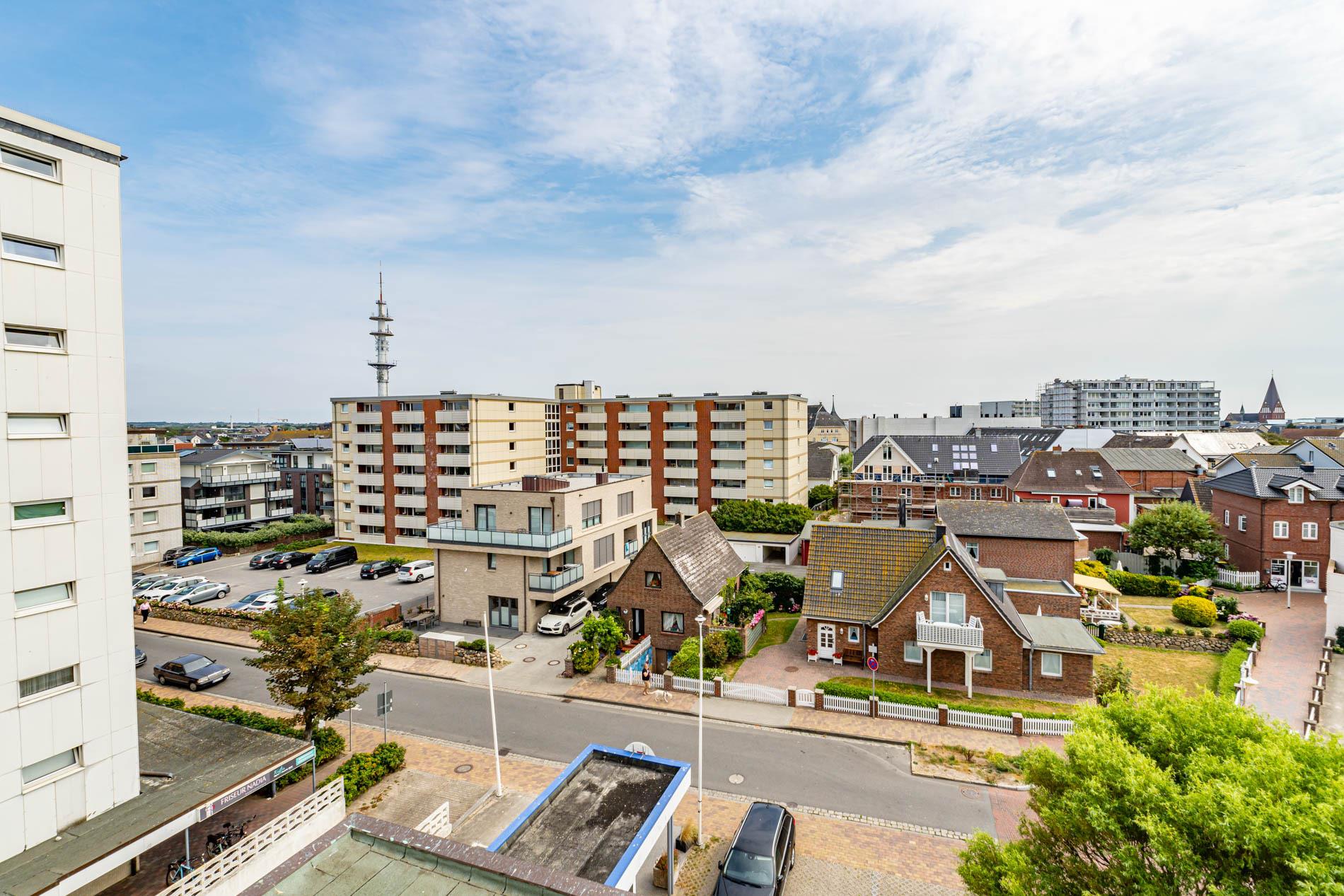Aufwendig renovierte 1-Zimmer-Nichtraucher-Ferienwohnung mit modernem Designerboden in Holzoptik, ca. 24 qm in der 4. Etage (Fahrstuhl im Haus) zur Ostseite mit weitem Blick über Westerland. Kombinieter Wohn/Schlafraum mit feststehendem Tischler-Doppelbett (Liegefläche 1,60 x 2m, mit guten Einzelmatratzen), großer Flachbild-TV, Kleiderschrank, Essplatz am Fenster mit 2 bequemen Stühlen, WLAN und kostenlose Telefonie ins deutsche Festnetz (Handynummern gesperrt), offene neue Einbau-Küchenzeile mit Mikrowelle, Nespresso-Maschine, Ceranfeld (2 Kochfelder) und Spülmaschine. Kaffeemaschine, Wasserkocher und Toaster gehören zur Grundausstattung, Neues Duschbad/WC, Ostbalkon mit Balkonmöbeln (Hochlehner) und Auflagen (Morgensonne).