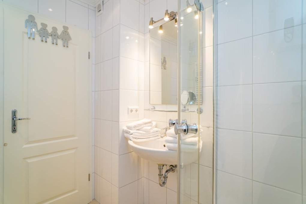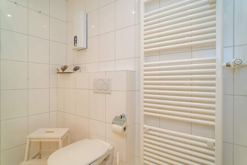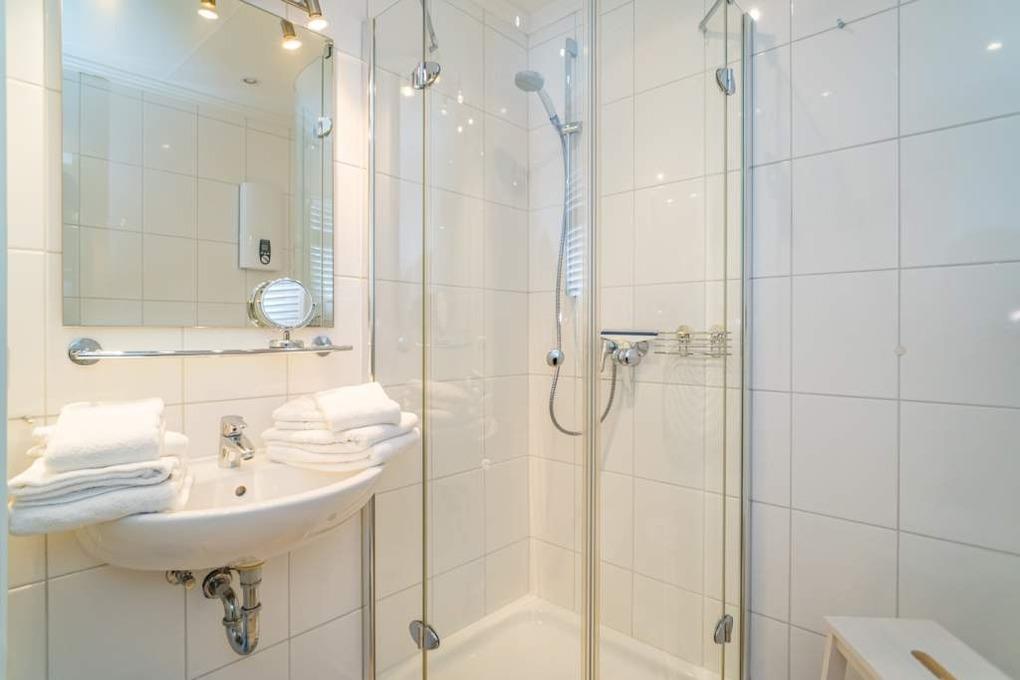 Das moderne Bad ist mit Dusche, Waschtisch, Handtuchtrockner, Fön und[nbsp][nbsp]Kosmetikspiegel komplett ausgestattet.