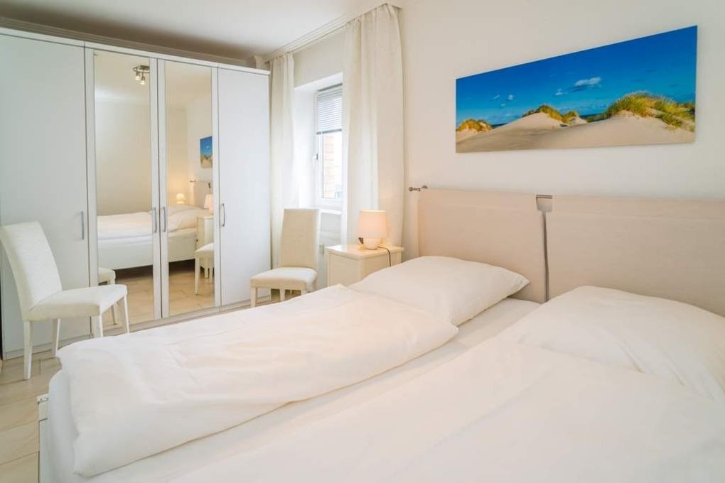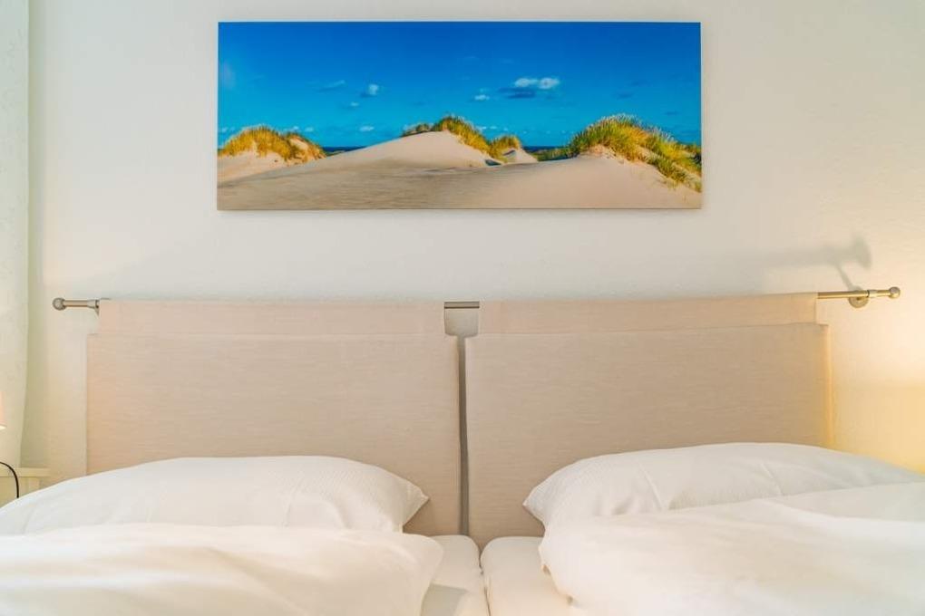 Das separate Schlafzimmer mit kleinem Meerblick nach Nordwesten bietet ein bequemes Doppelbett (Liegefläche 1,80 x 2,00 mit 2 Einzelmatratzen, Einstieg nur von einer Seite aus möglich) für guten Schlafkomfort.