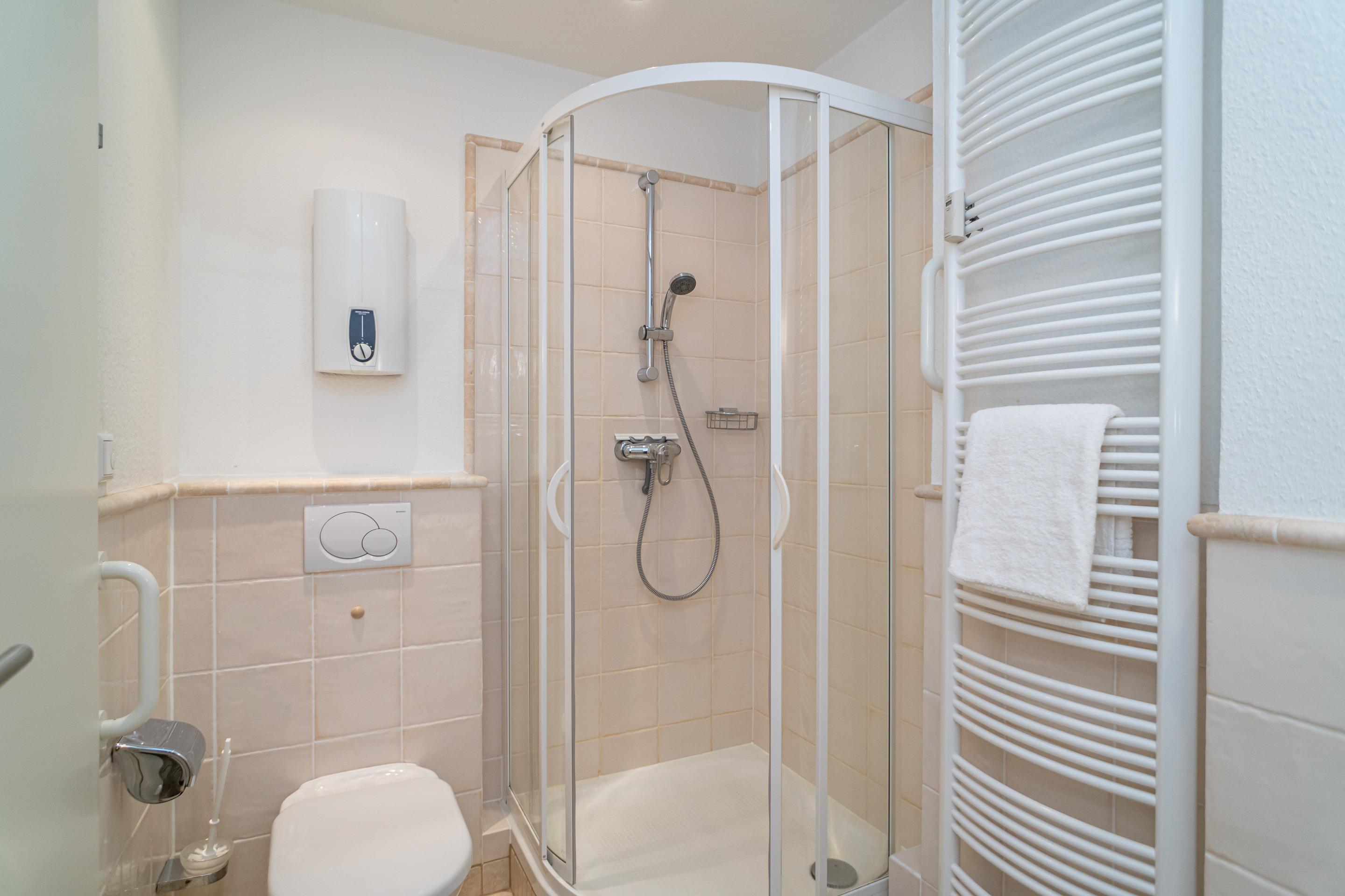 Das Bad/WC hat eine Dusche, einen Waschtisch und einen Handtuchtrockner.