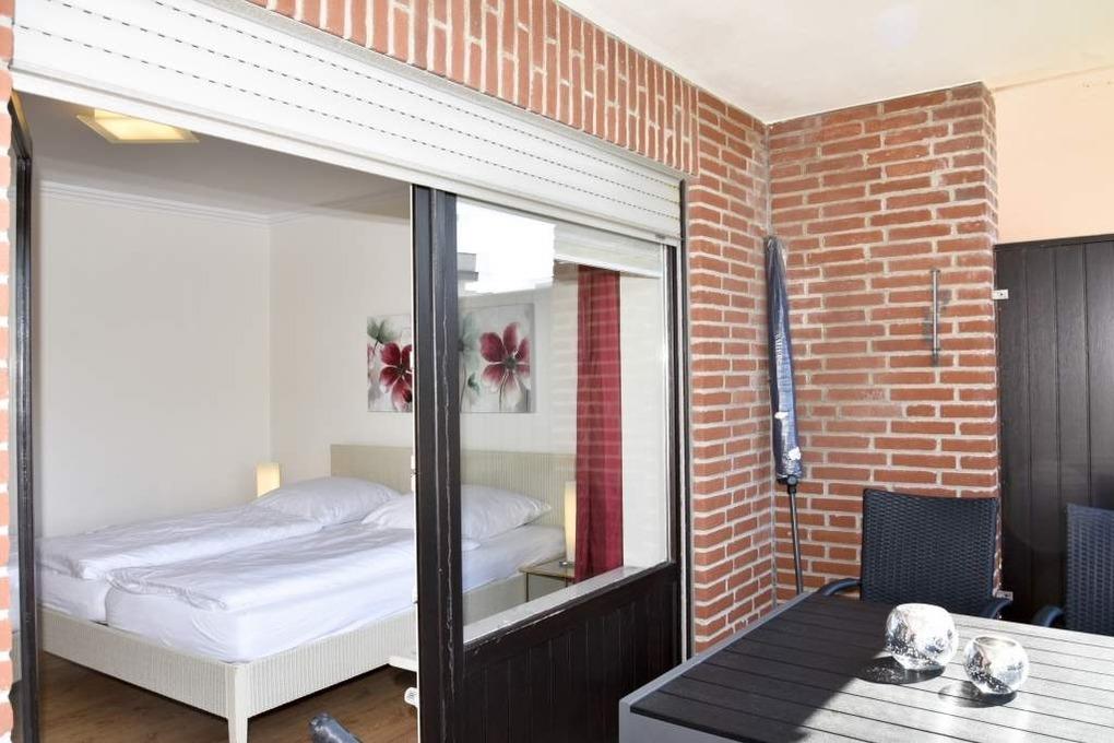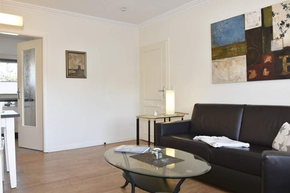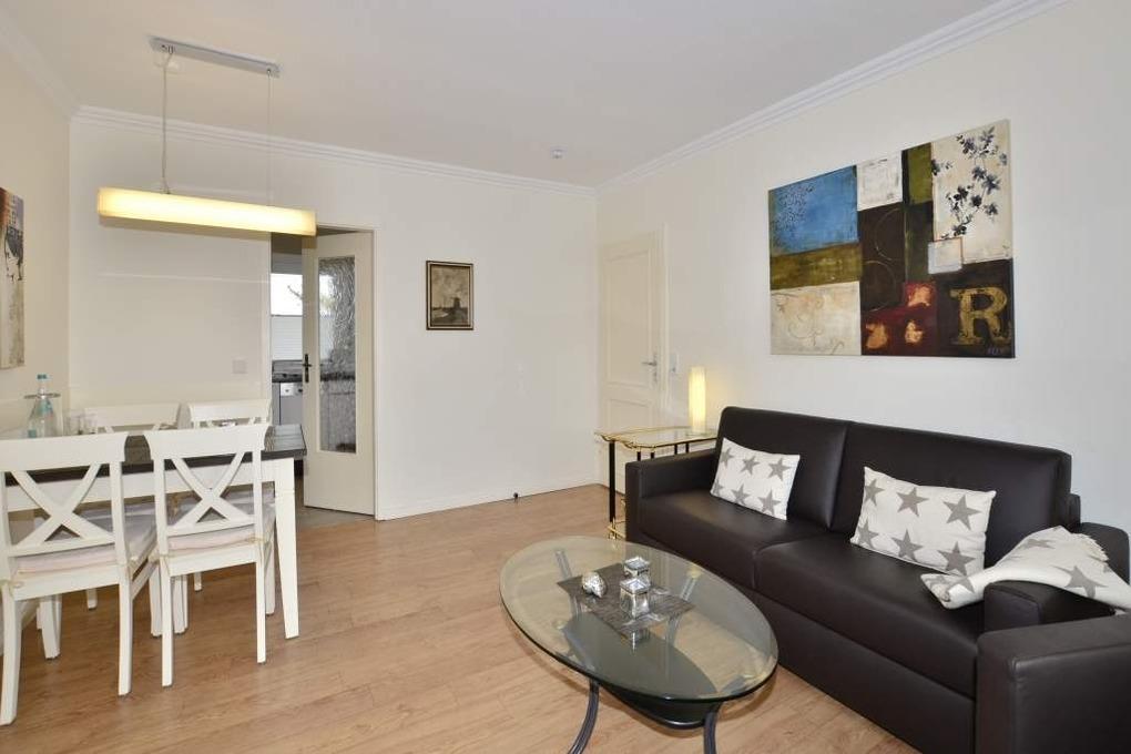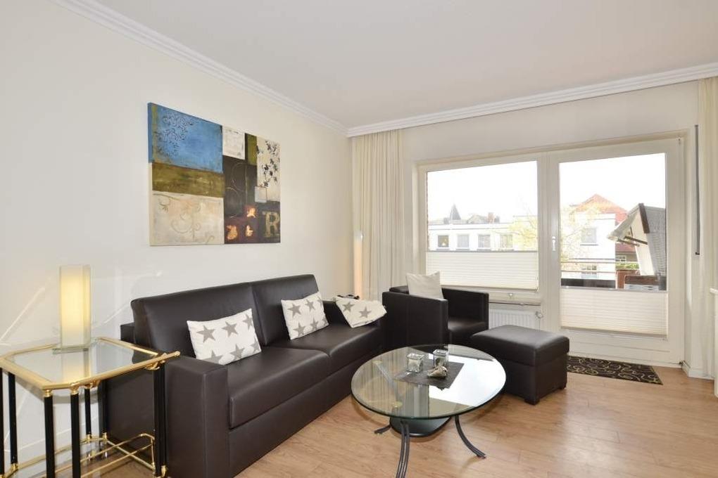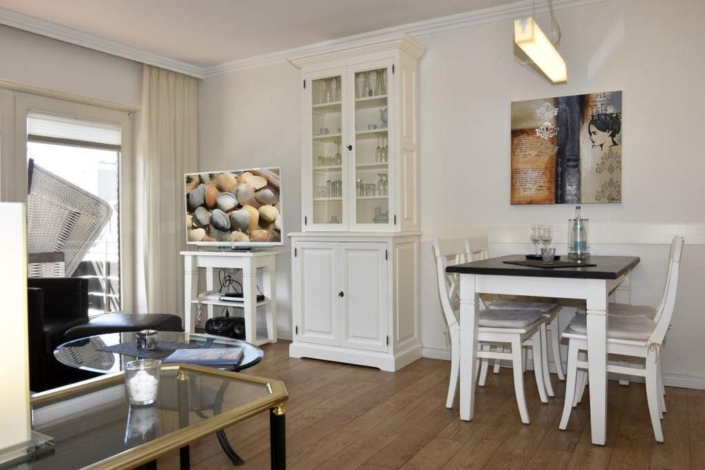 Der mit modernem Designerboden ausgelegte Wohnraum ist mit einer besonders komfortablen Leder-Garnitur von Bielefelder Werkstätten (2-Sitzer-Schlafcouch mit ausklappbarer Matratze in optimaler Liegehöhe, 1 Sessel mit Fußhocker), einem Essplatz, Kabel-Flachbild-TV, Radio/CD-Player und Telefon inklusive Flatrate für Gespräche ins deutsche Festnetz (Handynummern gesperrt), kostenlosem Internetnutzung per W-Lan ausgestattet. Vom Wohnraum hat man Zugang zur separaten Küche und zum großzügigen Westbalkon.
