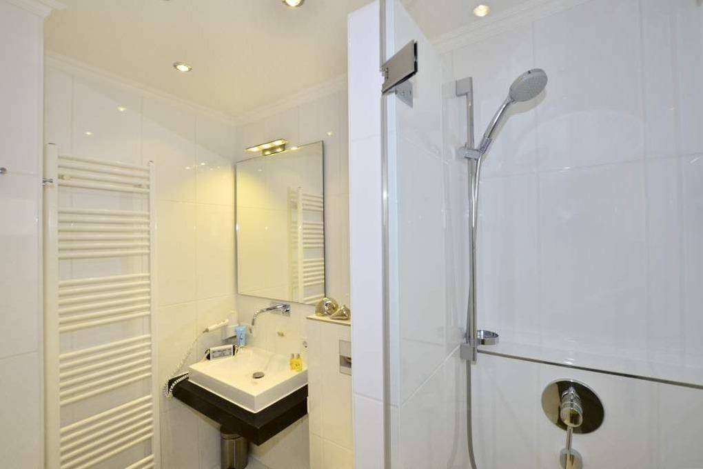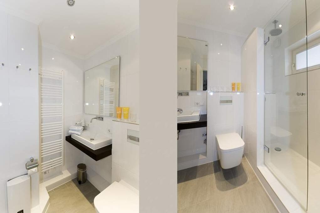 Das neue Duschbad ist mit einem Eichenwaschtisch, Handtuchtrockner, WC, großzügiger, flach begehbarer Dusche, Fön und Fenster ausgestattet.
