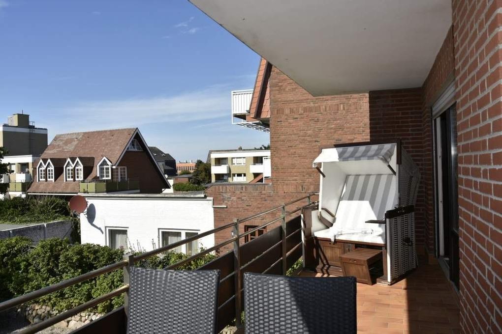 Der großzügige, mit Strandkorb und Gartenmöbeln möblierte Westbalkon ist sowohl vom Wohn- als auch vom[nbsp][nbsp]großen Schlafzimmer aus begehbar.