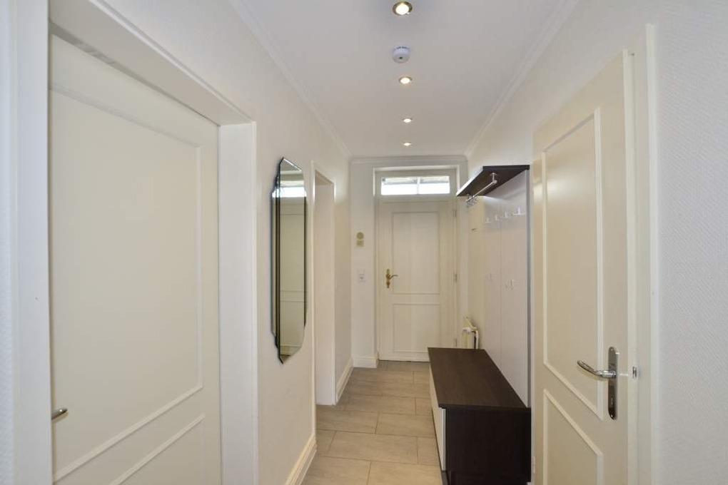 Vom Vorflur mit Garderobe gelangt man in das Wohnzimmer, in die beiden Doppel-Schlafzimmer und in das neue Duschbad/WC.