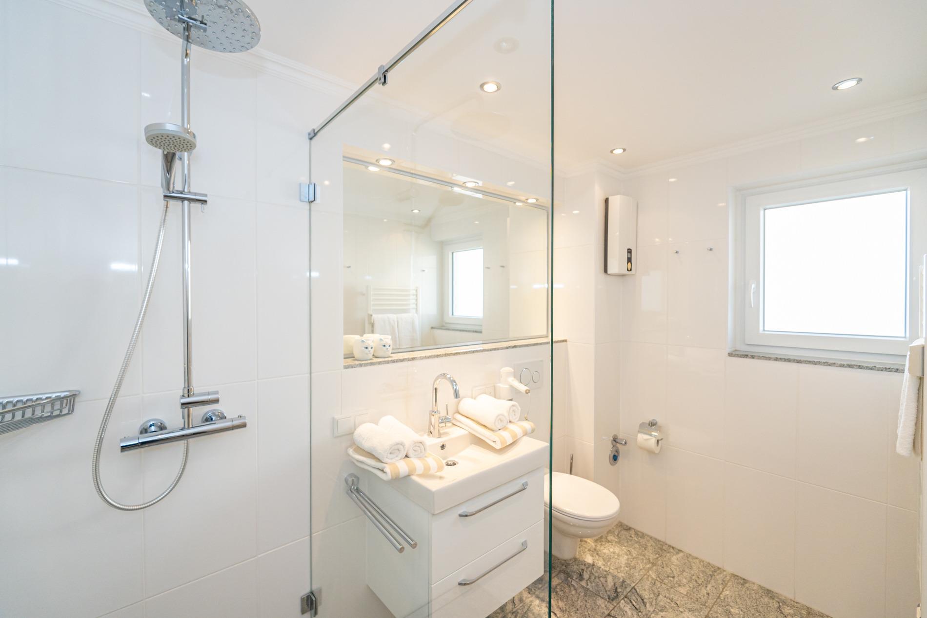 Das neue Badezimmer hat eine Dusche mit extra flachem Einstieg, einen Waschtisch, Handtuchtrockner, Fön, WC und ein Fenster.