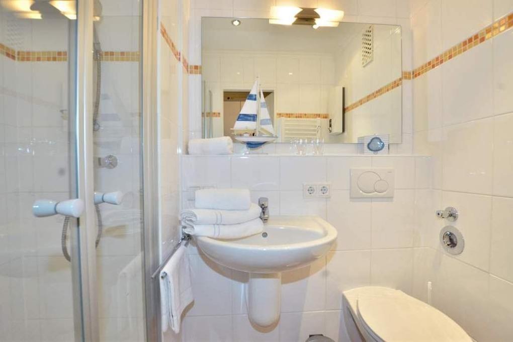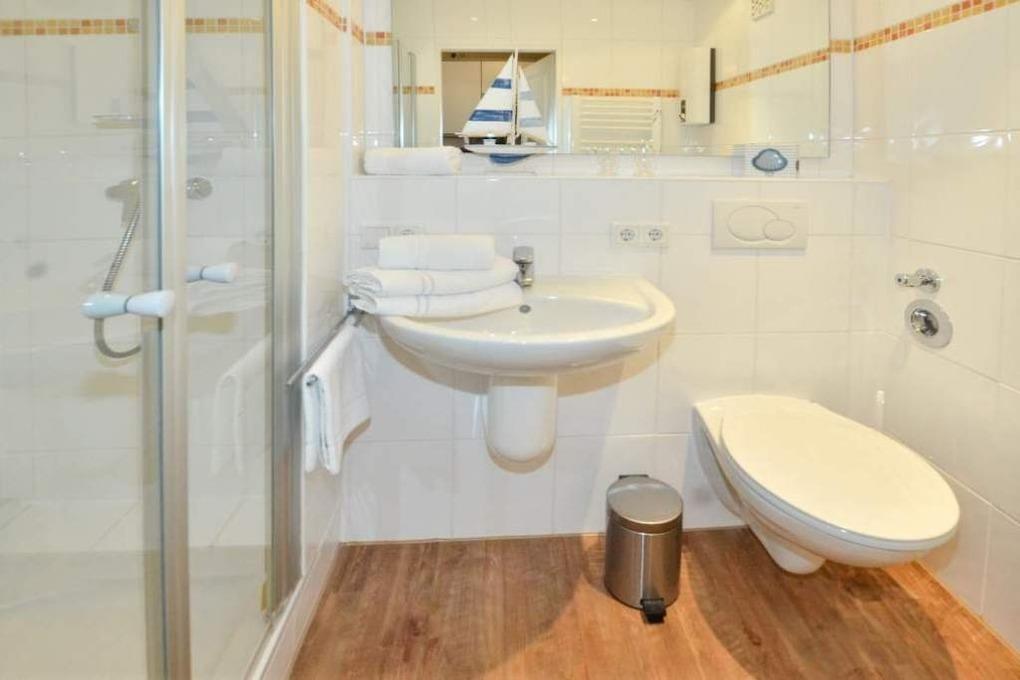 Im Bad befinden sich eine Dusche, ein WC, ein Waschtisch und ein kleiner Handtuchtrockner.