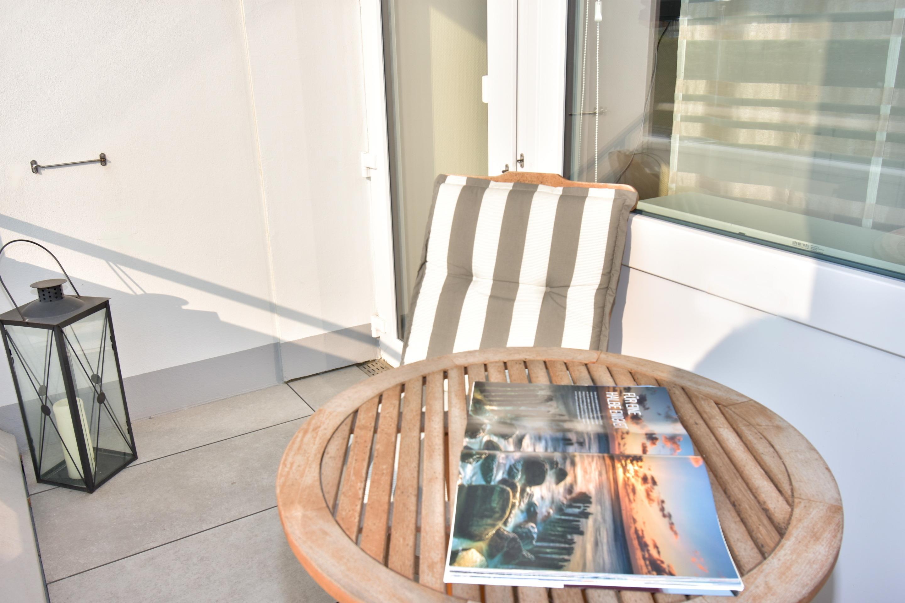 1-Zimmer-Nichtraucher-Ferienwohnung mit keramischen Bodenbelägen (ca. 25 qm) im Hochparterre zur Seeseite mit Westloggia (Nachmittagssonne und Abendsonne, mit Balkonmöbeln) für max. 2 Personen.